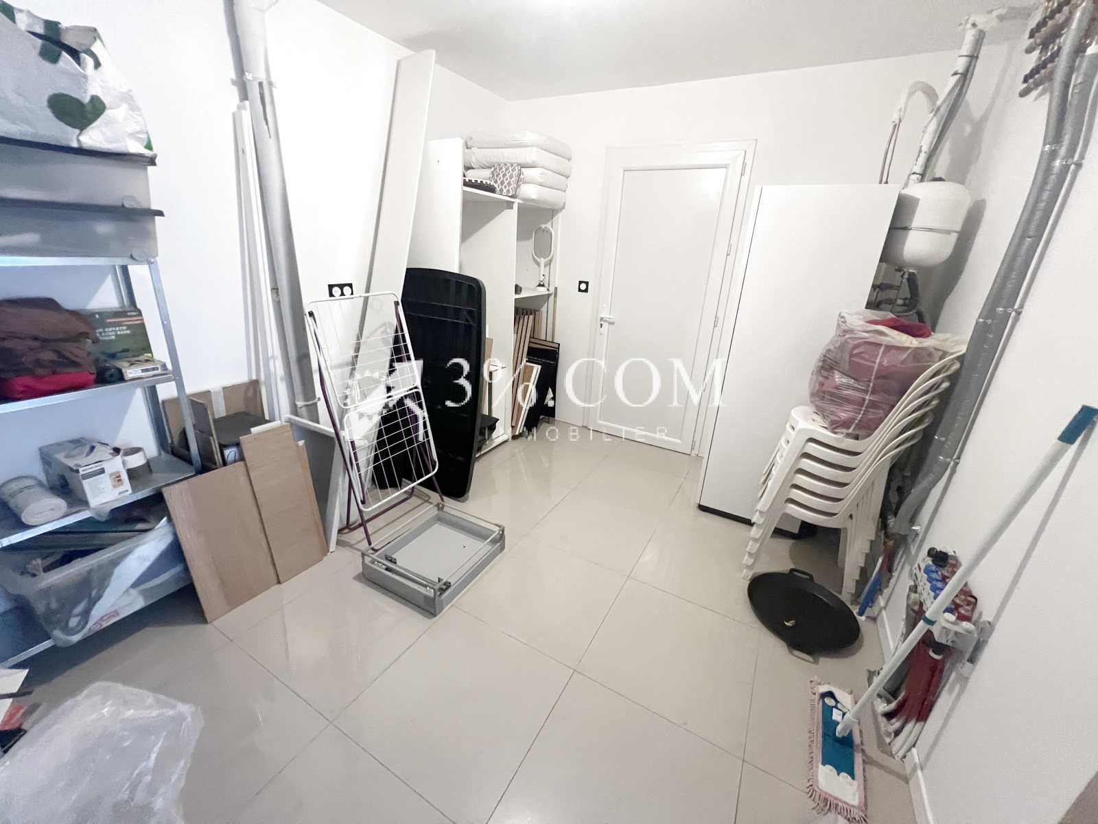 Un cellier avec porte de service donnant sur la terrasse arrière et le jardin