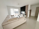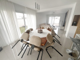 Une vaste pièce de vie baignée de lumière, composée d’un salon-séjour et d’une cuisine entièrement équipée, ouverte sur la terrasse grâce à de larges baies vitrées