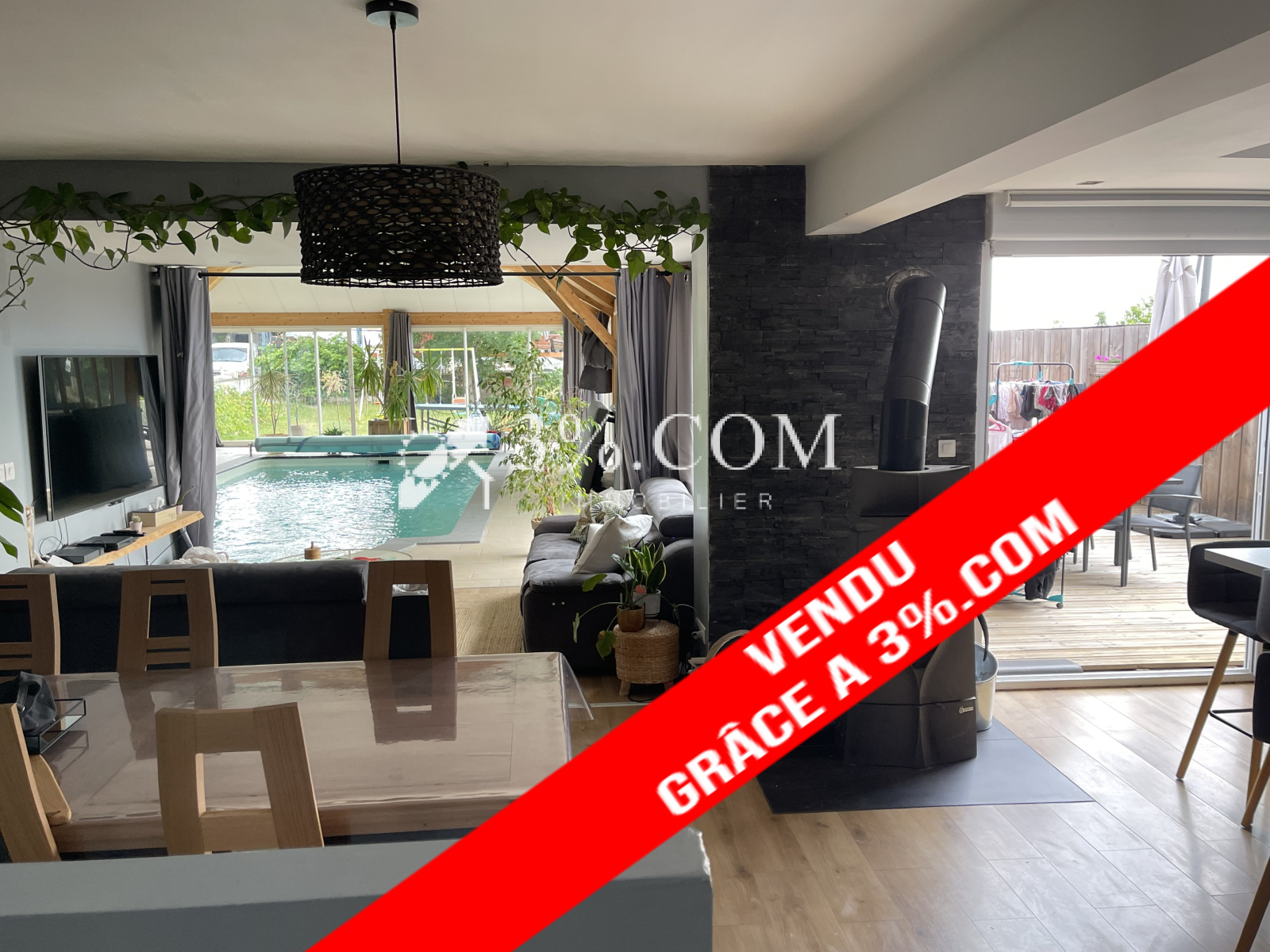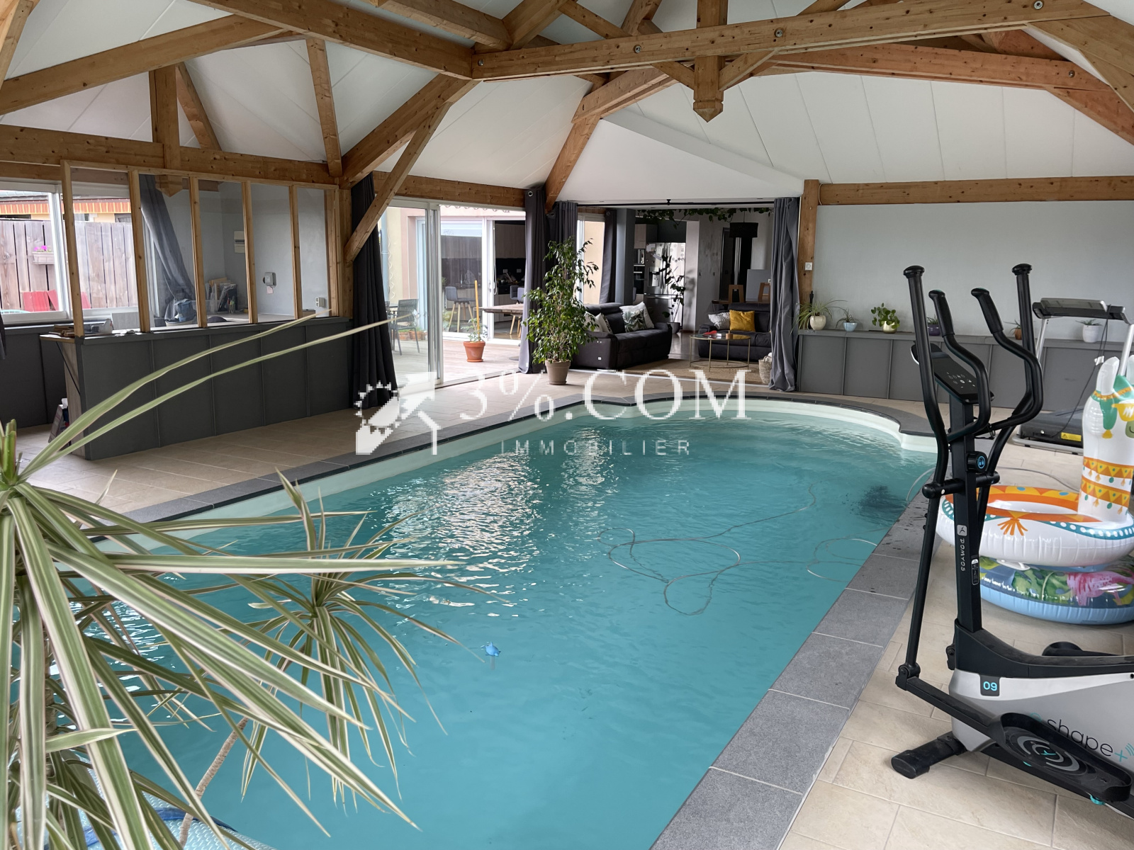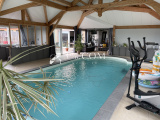 1 grand salon séjour de 27 m² donnant sur une piscine de 36 m² fermée et chauffée par une pompe à chaleur Air/Eau au milieu d'une magnifique dépendance de 87 m² avec charpente en bois.