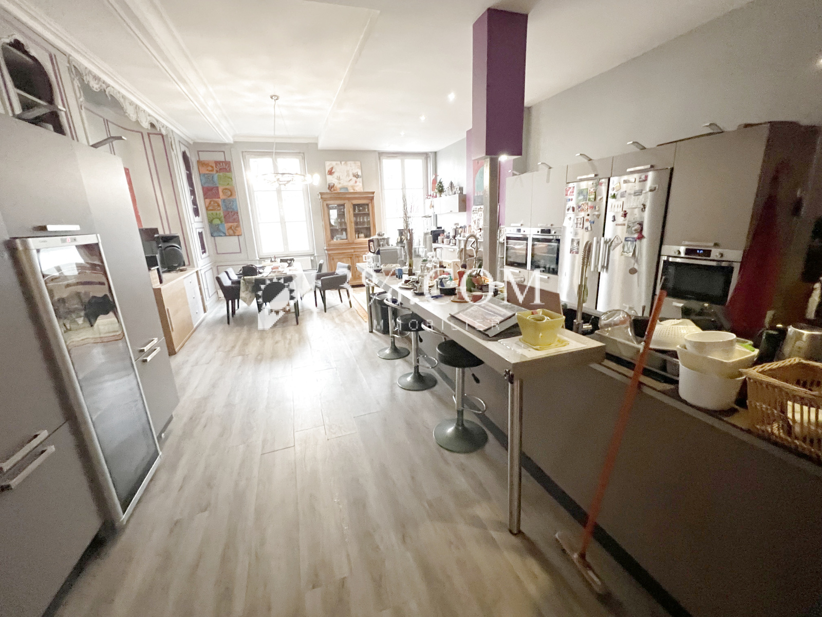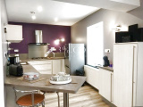 Dès l’entrée, le charme opère : une entrée majestueuse en pierres de taille ouvre sur une cuisine aux volumes remarquables, prolongée par une vaste pièce de réception :
