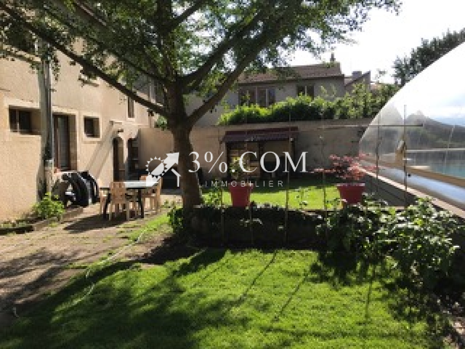 - Vue dégagée et accès direct au jardin paysagé et à la piscine creusée, chauffée via PAC.