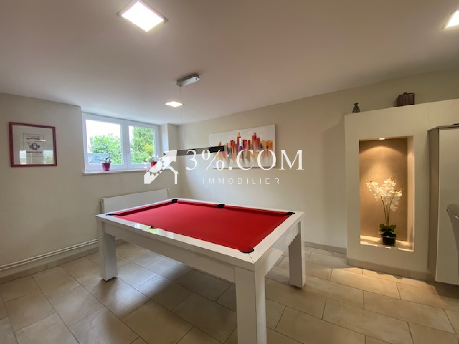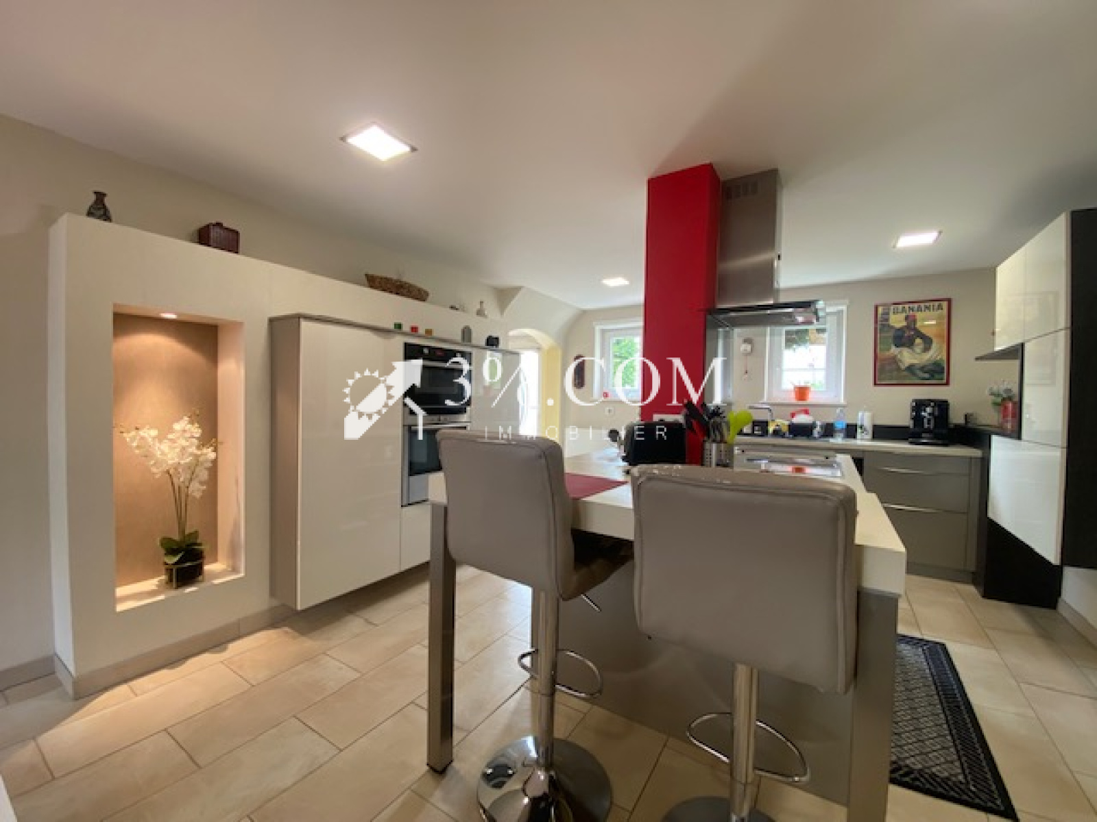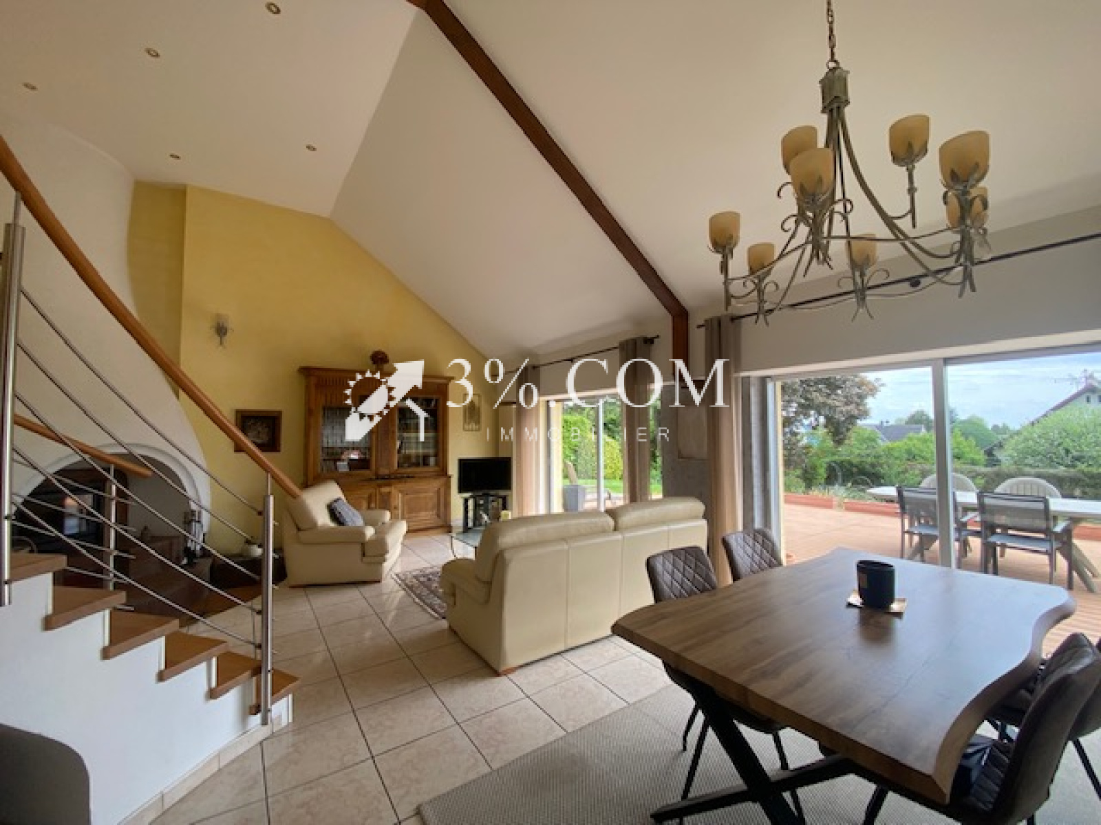3%.COM - DEJA VENDU - EXCLUSIVITE- L'agence 3%.COM a le plaisir de vous présenter cette belle maison d'architecte sur 9 ares située dans le village prisé de TRUCHTERSHEIM. -- RARE à la vente : Cette demeure vous charmera par ses volumes, son agencement et son jardin aménagé avec piscine. --Située au calme dans un quartier très résidentiel -- D'une superficie de 157m2, elle dispose de 3 chambres, 1 bureau, 2 salles de bain/d'eau, --Son salon en toit cathédrale avec sa cheminée ne pourra que vous séduire -- Un espace détente avec terrasse et piscine, un garage double motorisé complètent ce bien. -- Lumineuse, fonctionnelle, idéale pour famille --- Vous recherchez une maison de qualité dans un village dynamique alors n'hésitez pas et venez visiter ce bien. --- Au rez de chaussée: -- une entrée -- une suite parentale avec sa salle de bain (19m²) -- un toilette séparé --- Au niveau terrasse: -- salon ( 40m2) -- cuisine (28m2) --toilette --bureau (13m2) --cave, chaufferie, buanderie -- Au 1er: - espace bureau (18m2) - 2 chambres --1 salle de bain avec toilette --- A l'extérieur : - Garage double (36m2) porte motorisée - piscine chauffée par PAC - dépendance avec cuisine d'été Informations diverses : --Chauffage par PAC (2019) - ballon thermodynamique --Retrouvez plus de photo sur notre site troispourcent -- Contactez Sandrine ROTH 06 58 67 64 84 - Agence Immobilière ROTH IMMOBILIER Sarl, 3%.COM, RCS 803 863 638. -- Agence et vitrines à Hochfelden, siège à Gimbrett-Kochersberg. -- Réseau national à honoraires réduits: 3% TTC