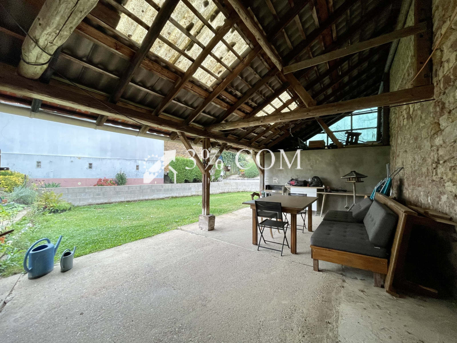 --- jardin, terrasse couverte et espace engazonné attenant à la grange.