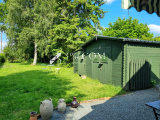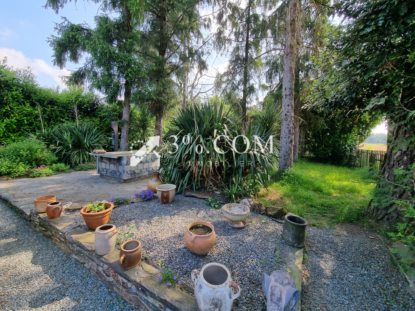 --- A l'exterieur : un jardin arboré clôturé avec un garage attenant à la maison avec combles, un abri de jardin et un puits.