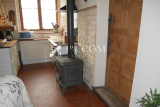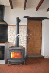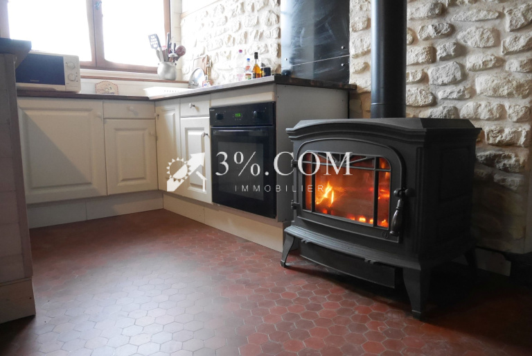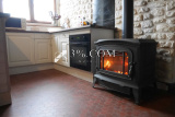 une Pièce de vie Salon-Séjour-Cuisine avec une belle cheminée en pierre, doublée d'un poêle à bois,