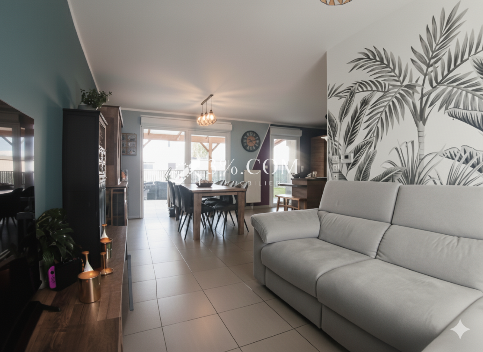 Dès l'entrée, un hall accueillant dessert une pièce de vie lumineuse.