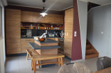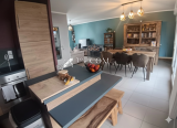 Cet espace chaleureux intègre un salon-séjour convivial ainsi qu'une cuisine ouverte aménagée et équipée.