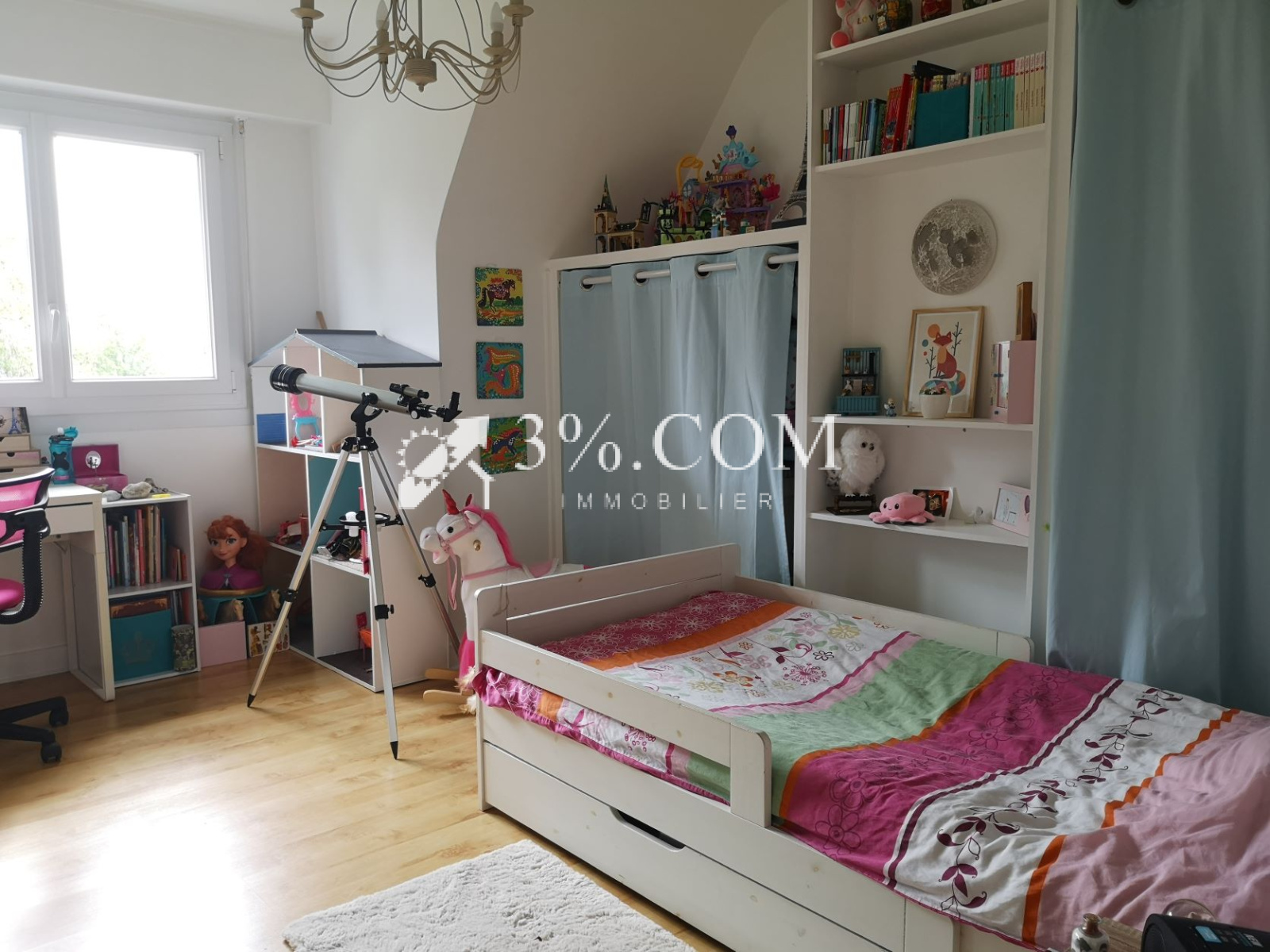 A l'étage, un palier dessert 3 chambres dont une aménagée de nombreux placards, un WC avec lave-mains et une salle de bains avec douche.