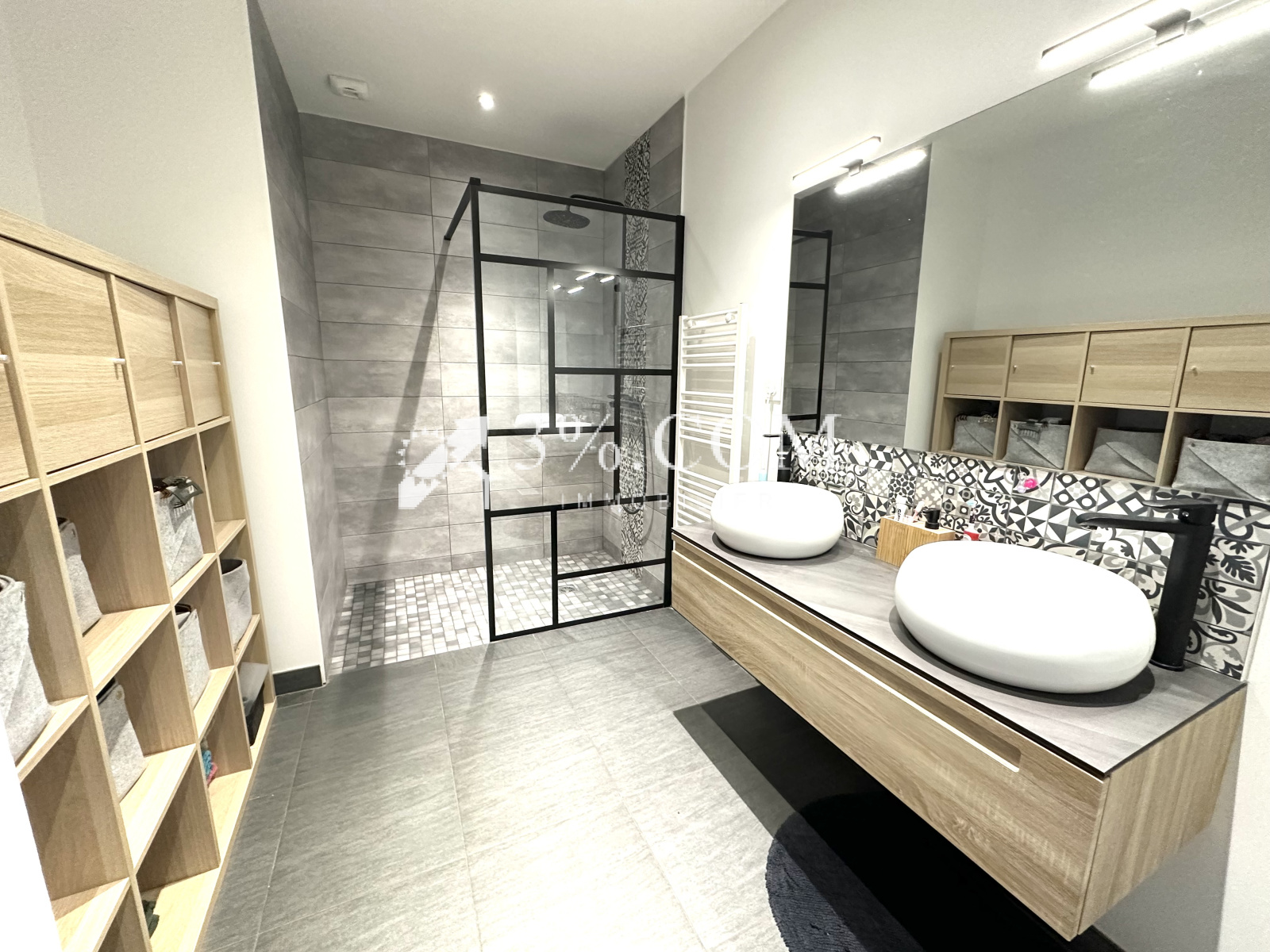 - Une très grande salle de bains comprenant une double vasque, une douche à l'italienne, ainsi qu'un meuble de rangement avec compartiments,