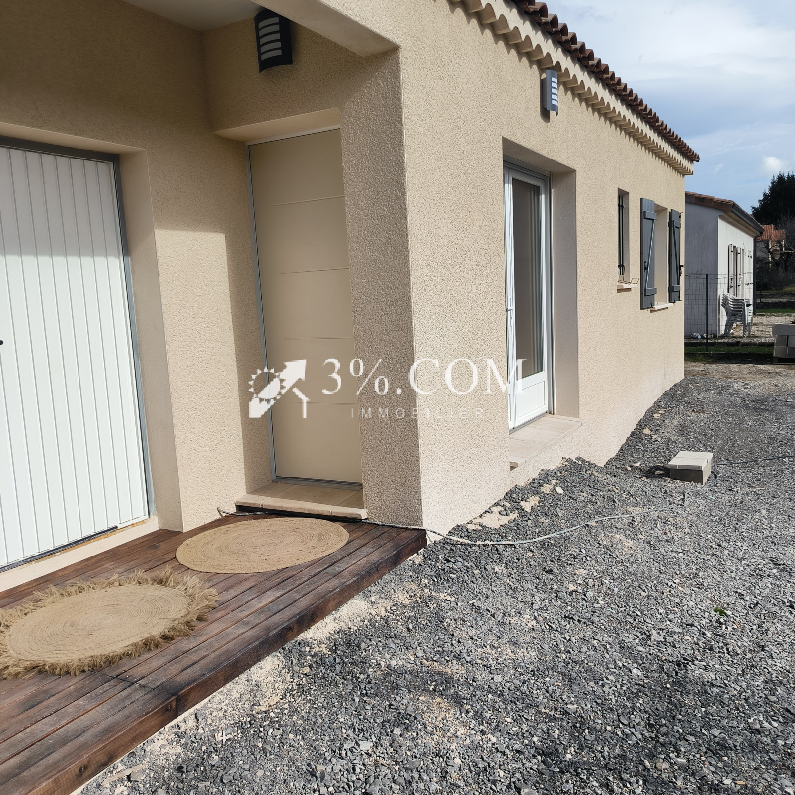 07380 JAUJAC. Maison récente à 15 minutes de AUBENAS sur un terrain de 400m2 construite en 2022 DPE classé A, 3 pièces 65.9 m2 habitable + garage, 1 entrée avec un portail coulissant, une cuisine ouverte sur salon, une salle de bains, un wc, deux chambres. Chauffage électrique à inertie sèche et Climatisation.