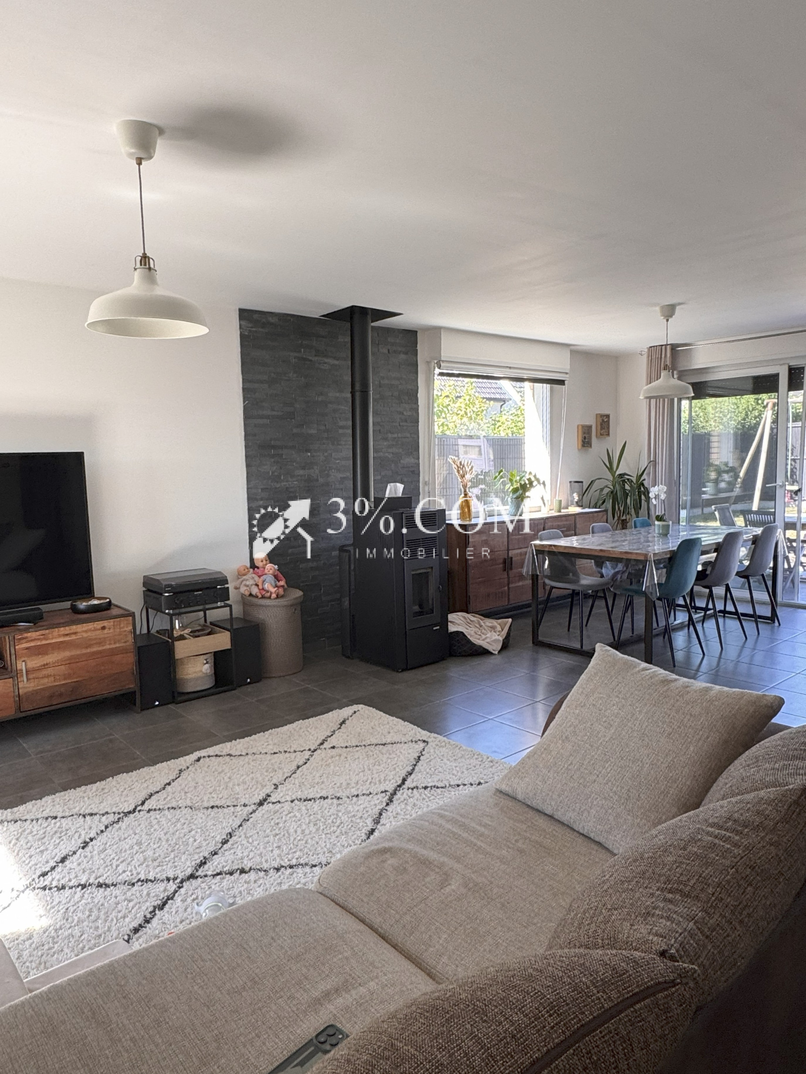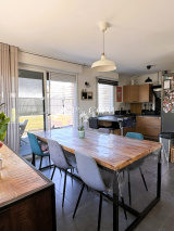 Vous y trouverez une vaste pièce de vie lumineuse avec salon, séjour, cuisine équipée ouverte et un accès direct par une grande baie vitrée à la terrasse et au jardin.