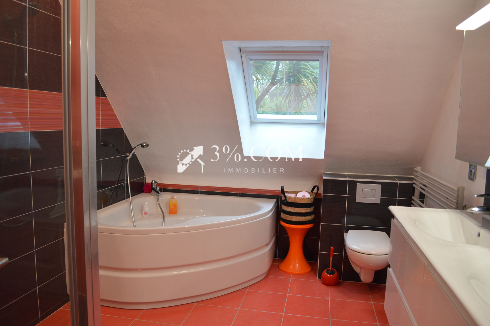 Une salle de bain (baignoire et douche à l'italienne) meuble double vasque, sèche serviette et wc.