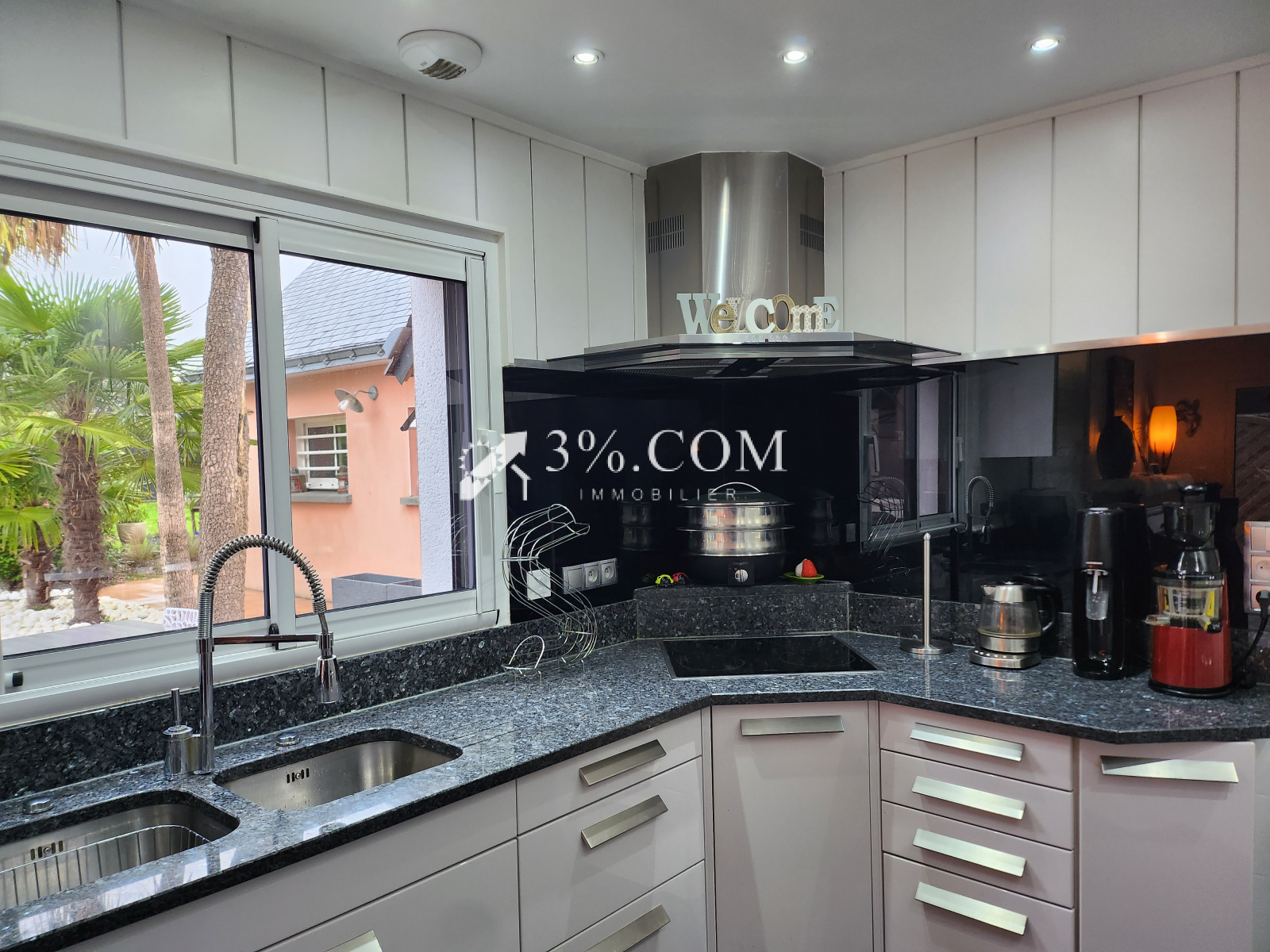 Un séjour-salon-cuisine aménagée et équipée (four, plaque, hotte, lave vaisselle, frigo-congélateur, four micro-onde et plan de travail en granit) de 50 m² avec cheminée et insert sur terrasse plein Sud.