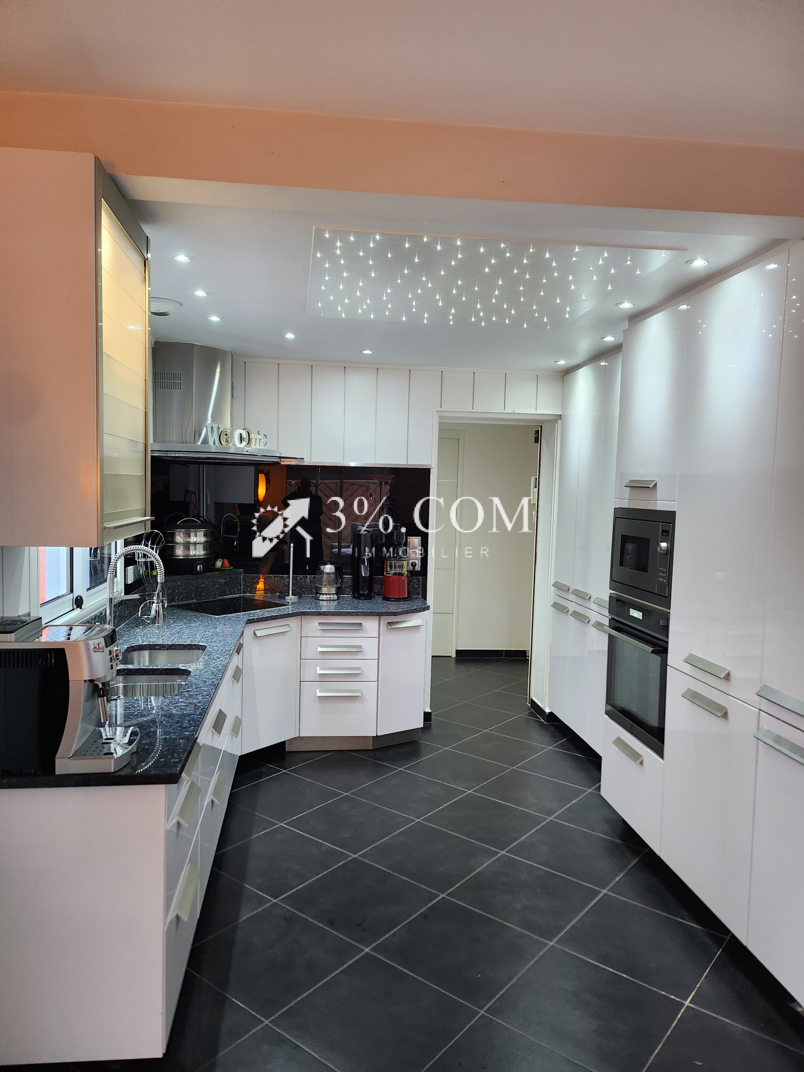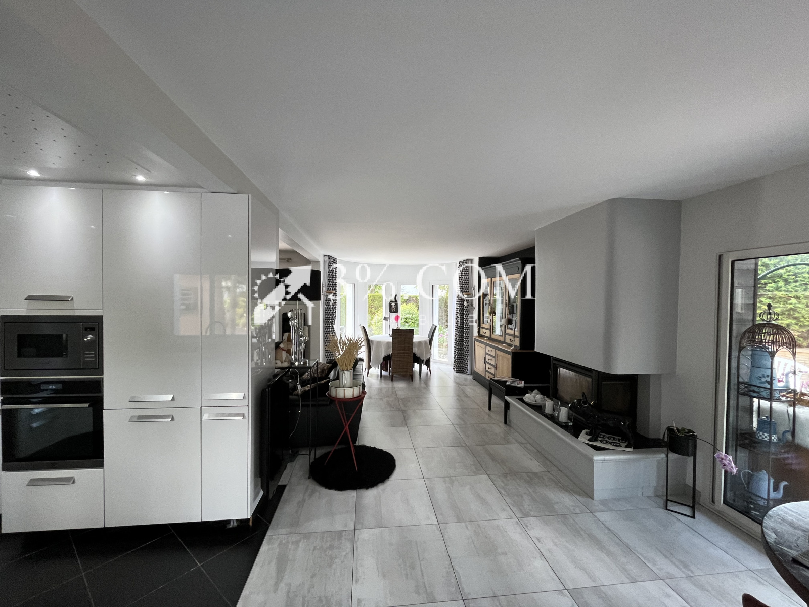 Un séjour-salon-cuisine aménagée et équipée (four, plaque, hotte, lave vaisselle, frigo-congélateur, four micro-onde et plan de travail en granit) de 50 m² avec cheminée et insert sur terrasse plein Sud.