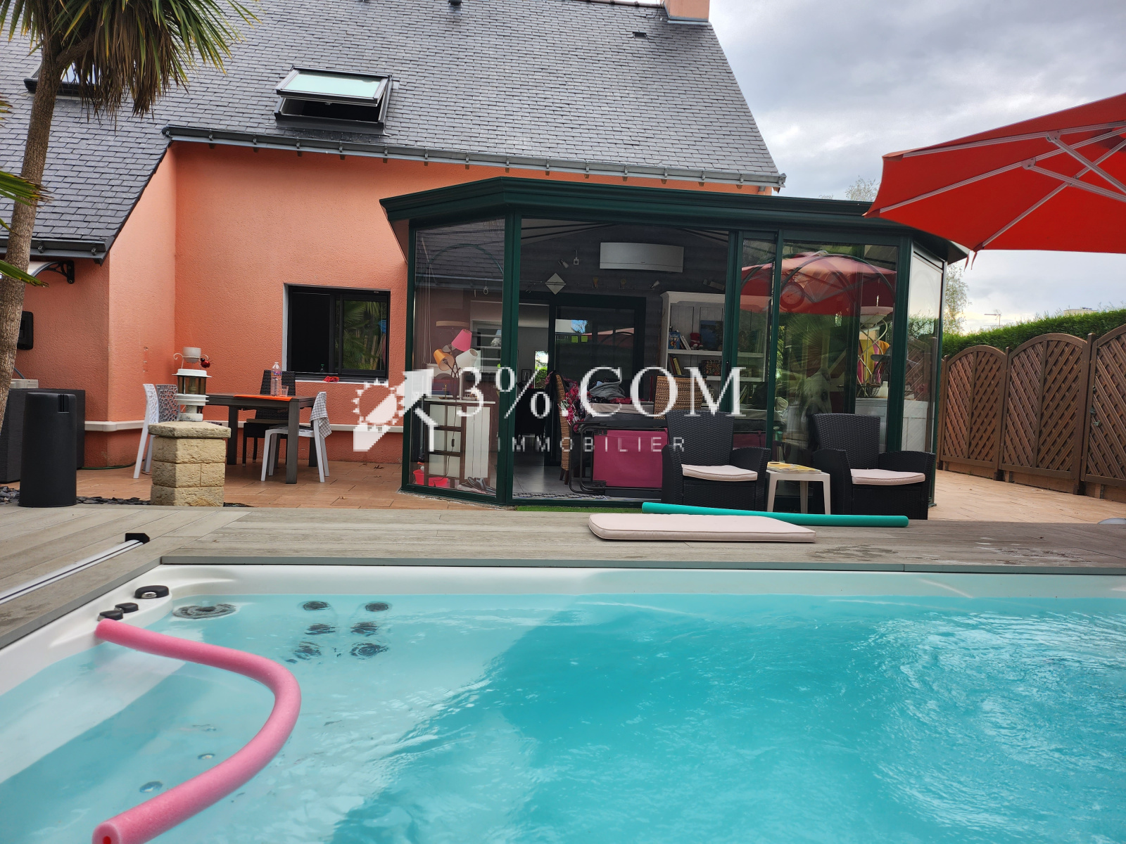 Sur un terrain de 715 m² arboré et paysagé avec piscine posée en 2019 (jacuzzi, nage à contre courant, balnéo, terrasse recouvrante et coulissante en résine de synthèse),