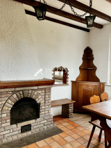 - Salle à manger conviviale avec banquette en bois, cheminée à foyer ouvert et espace bar,