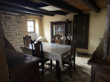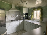 Elle se compose au rez de chaussée d une cuisine meublée d une salle de bain avec toilettes ainsi qu un espace salon avec cheminée et d une partie salle a manger avec son poele a bois .