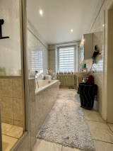 -- Une salle de bain/wc (douche/baignoire, lavabo simple vasque, wc) traversante donnant accès à une grande chambre.