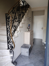 Au rez de chaussée: belle entrée fermée avec un escalier en fer forgé, une pièce de vie d'envion 30m² avec une partie salon et une autre salle à manger attenante à la cuisine actuellement fermée, la cuisine est équipée et fait environ 12m². Vous disposez toujours sur ce même niveau d'une chambre de 12m², d'une salle de bain équipée d'une douche italienne, d'un wc indépendant relié au tout à l'égout.