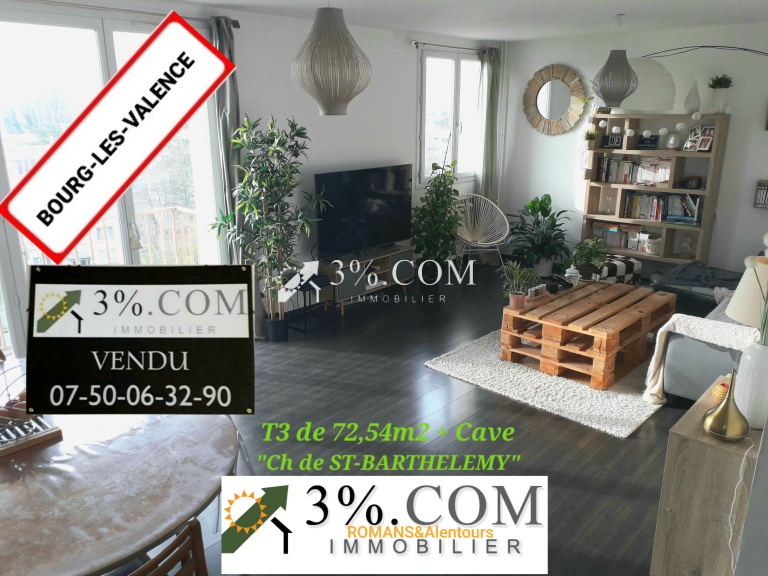 -***VENDU-***Sur la commune de Bourg-Lès-Valence Chemin de ST BARTHELEMY en Exclusivité , nous vous proposons l'achat d'un appartement de type T3 disposant de 2 chambres (9,50m2 & 11,50m2). Un grand dressing HOMME/FEMME de 4m2 juxtapose celles-ci. Ce logement serait idéal pour un jeune couple. Une cave de 4m2 vient compléter ce bien au SOUS-SOL.