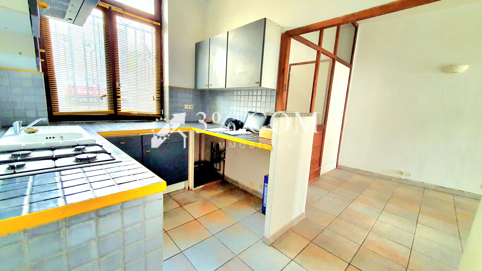 _ Une cuisine américaine carrelée équipée meubles, hotte, plaque de cuisson