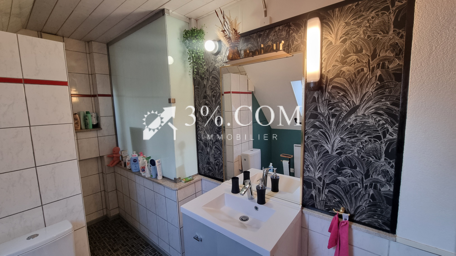 et une salle d’eau avec douche et toilette.