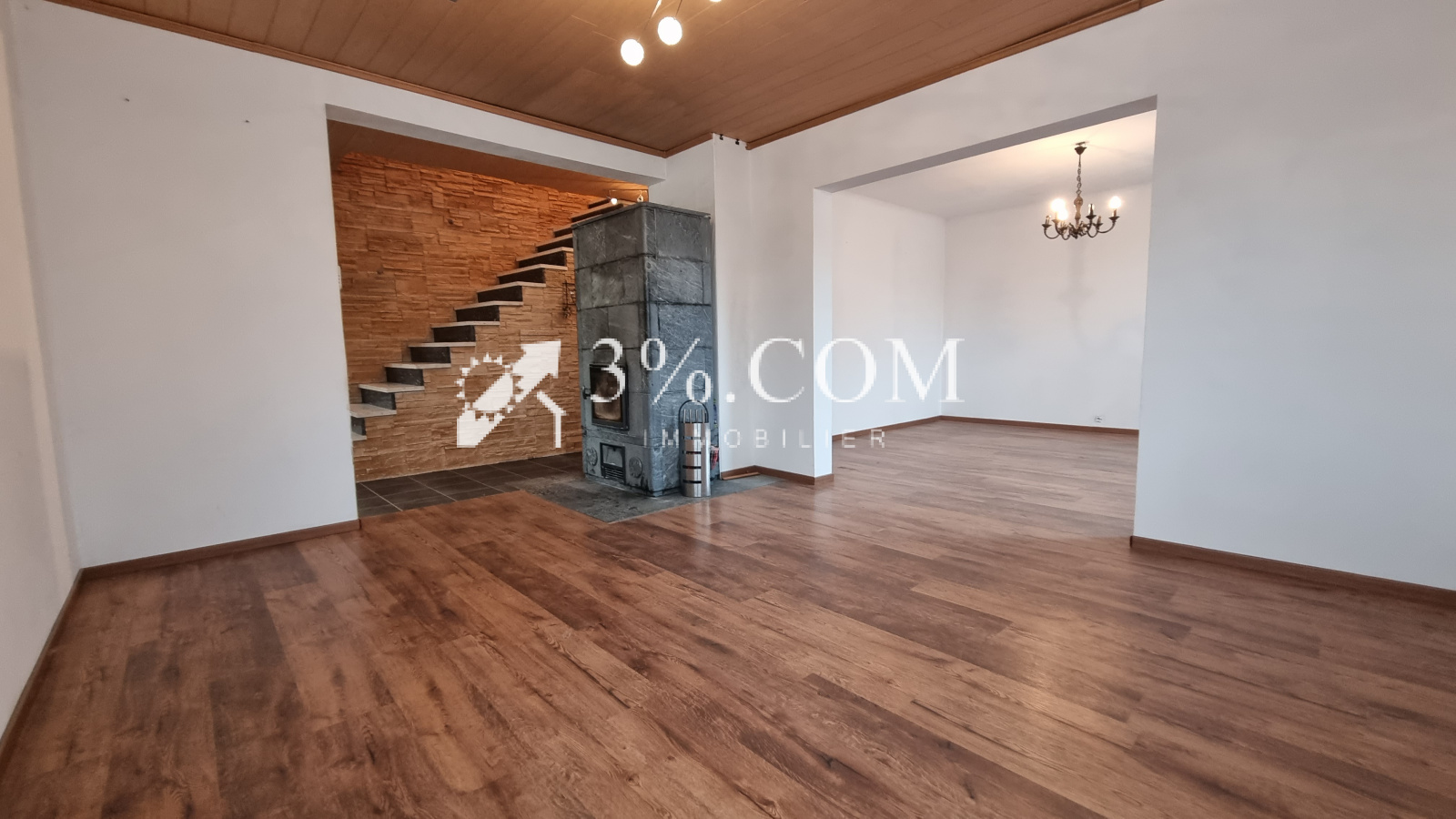 1 espace salon-séjour de 34m² avec poèle à bois.