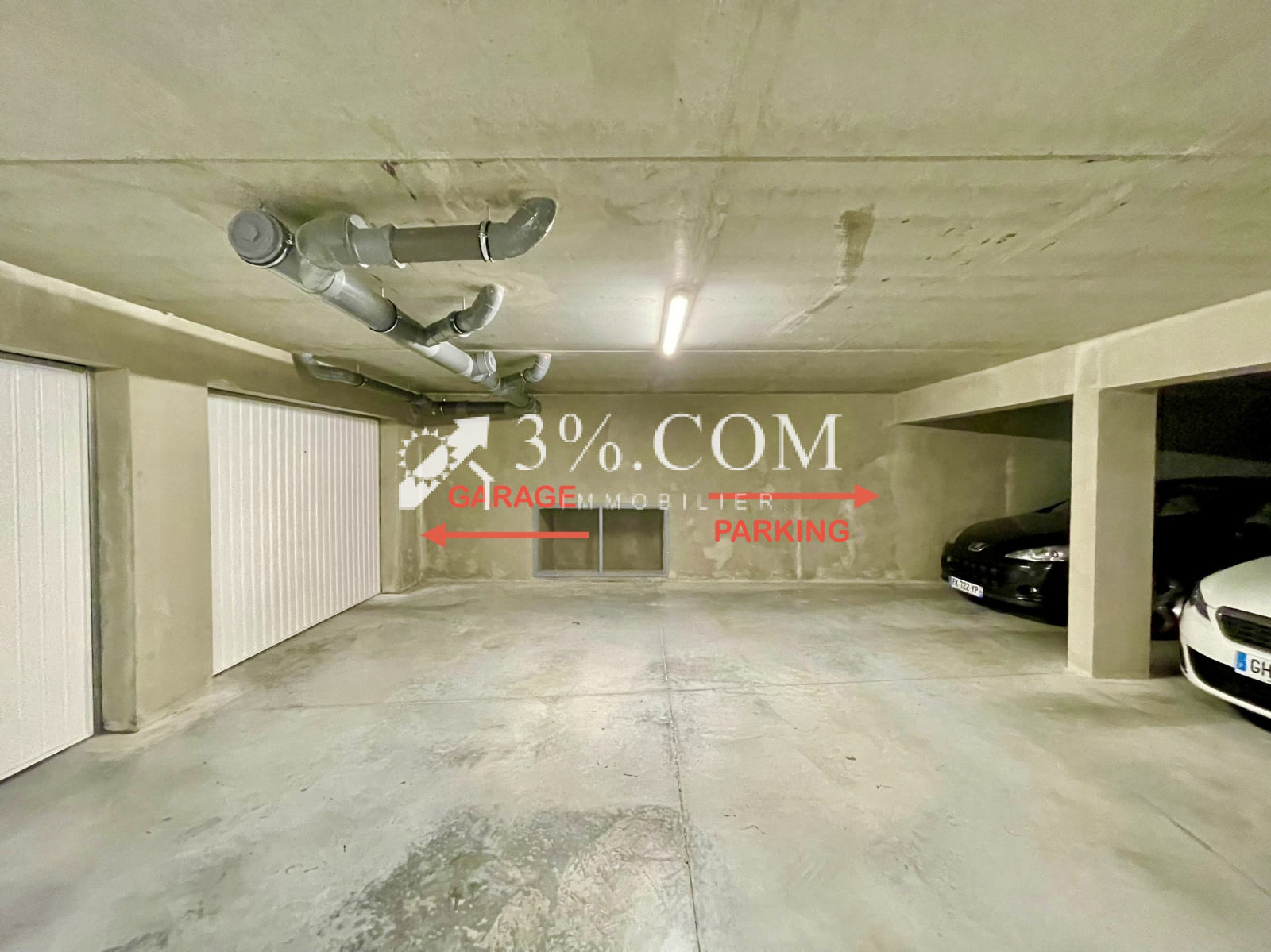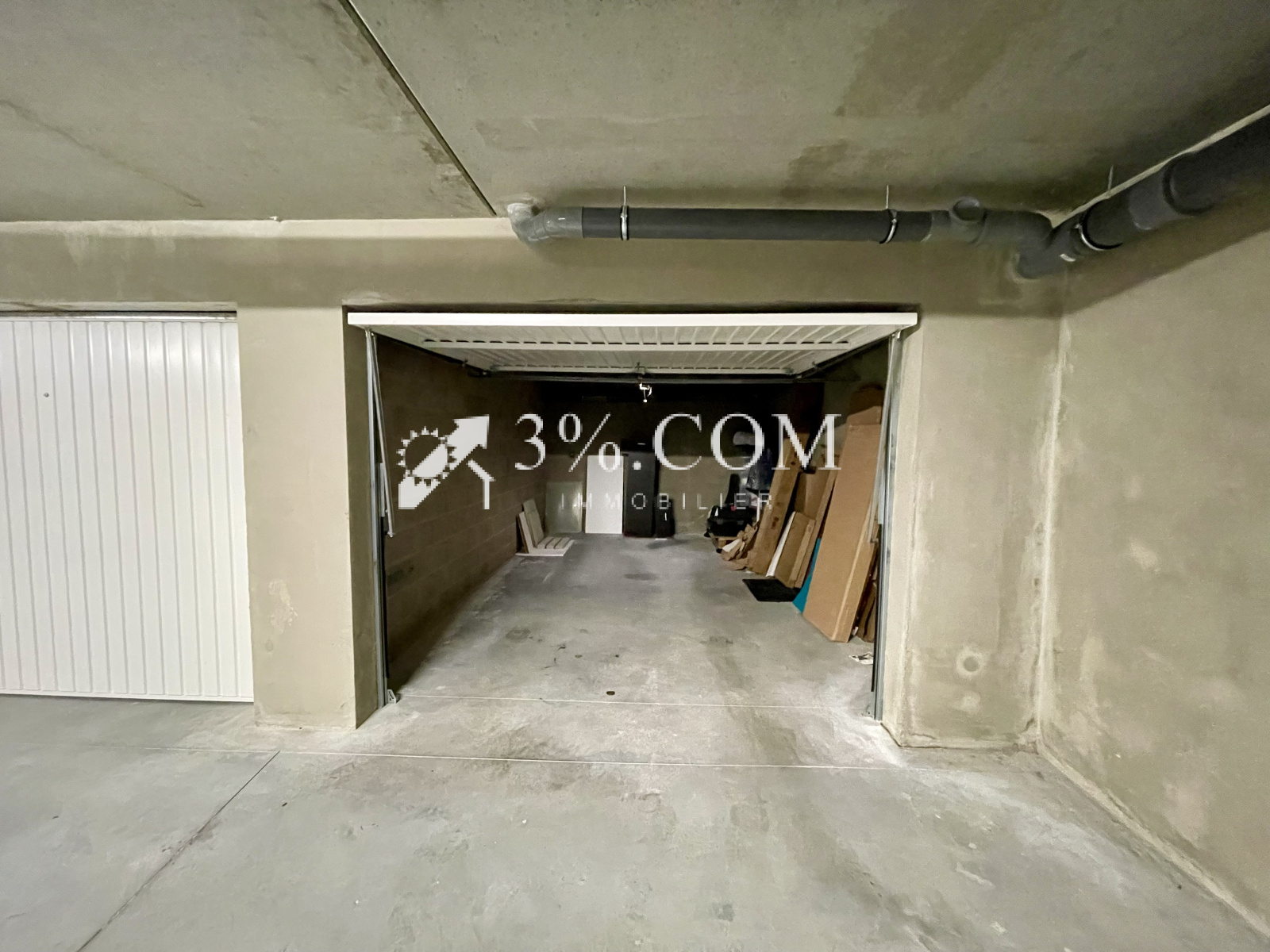 - 1 garage (18m²) en sous/sol (Porte de garage motorisée) équipé de prise et lumière reliées au compteur de l’appartement.