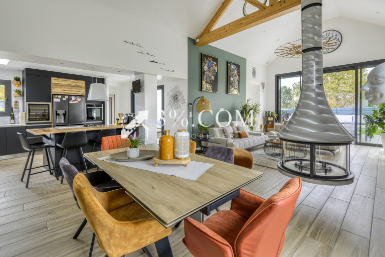 La maison offre des volumes généreux dont une pièce de réception de 75 m² ouverte sur la piscine et la nature comprenant une cuisine ouverte avec ilot central et équipement de grande qualité. un salon salle à manger et une pièce de détente patio intérieur.