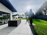 Dotée de lignes épurées et résolument orientée vers les espaces extérieurs paysagés mêlant un jardin de 1300m² avec terrasse de 60 m²