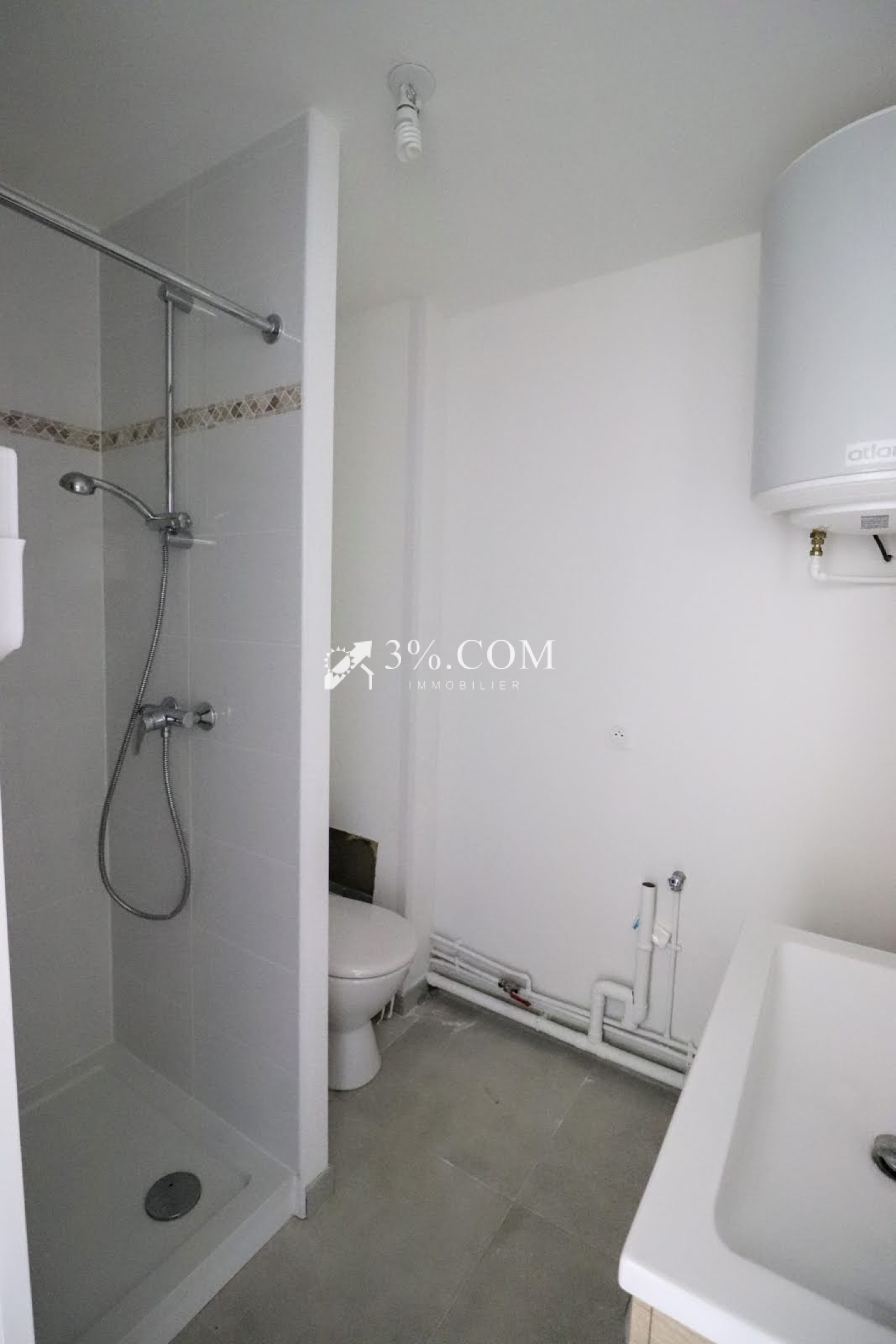 Salle de bain avec douche, vasque, wc et évacuation pour lave linge