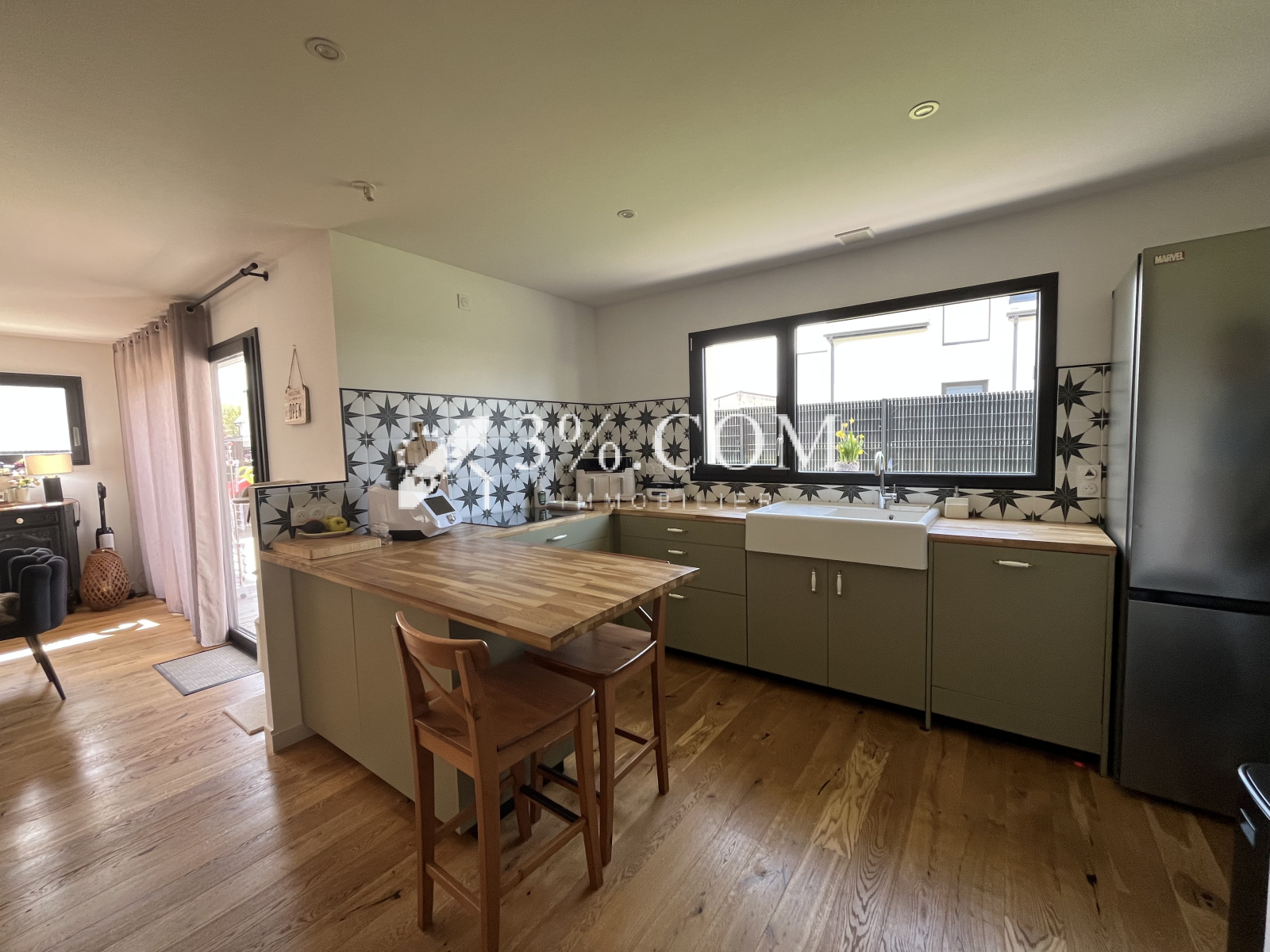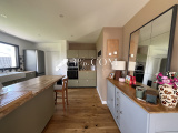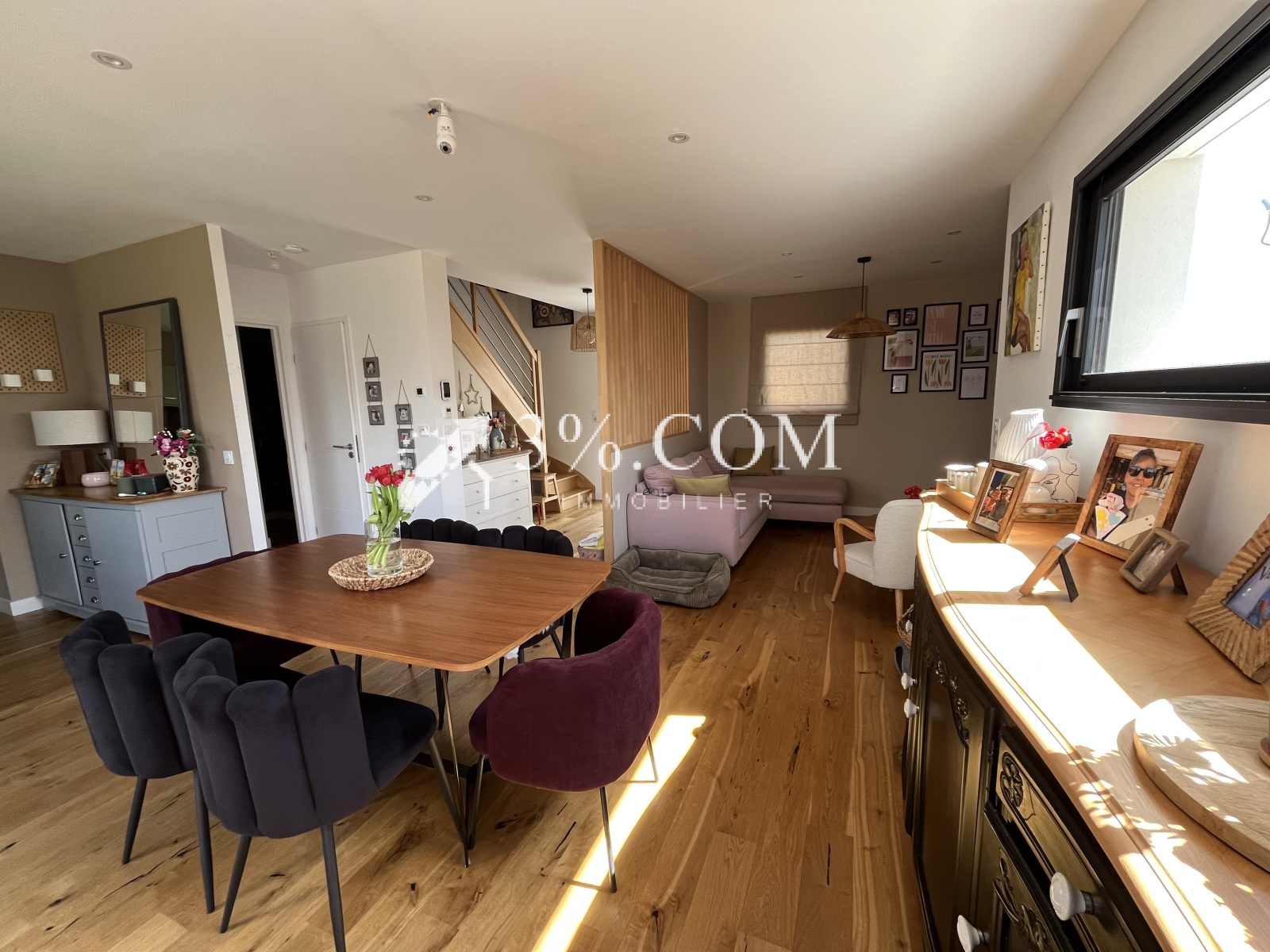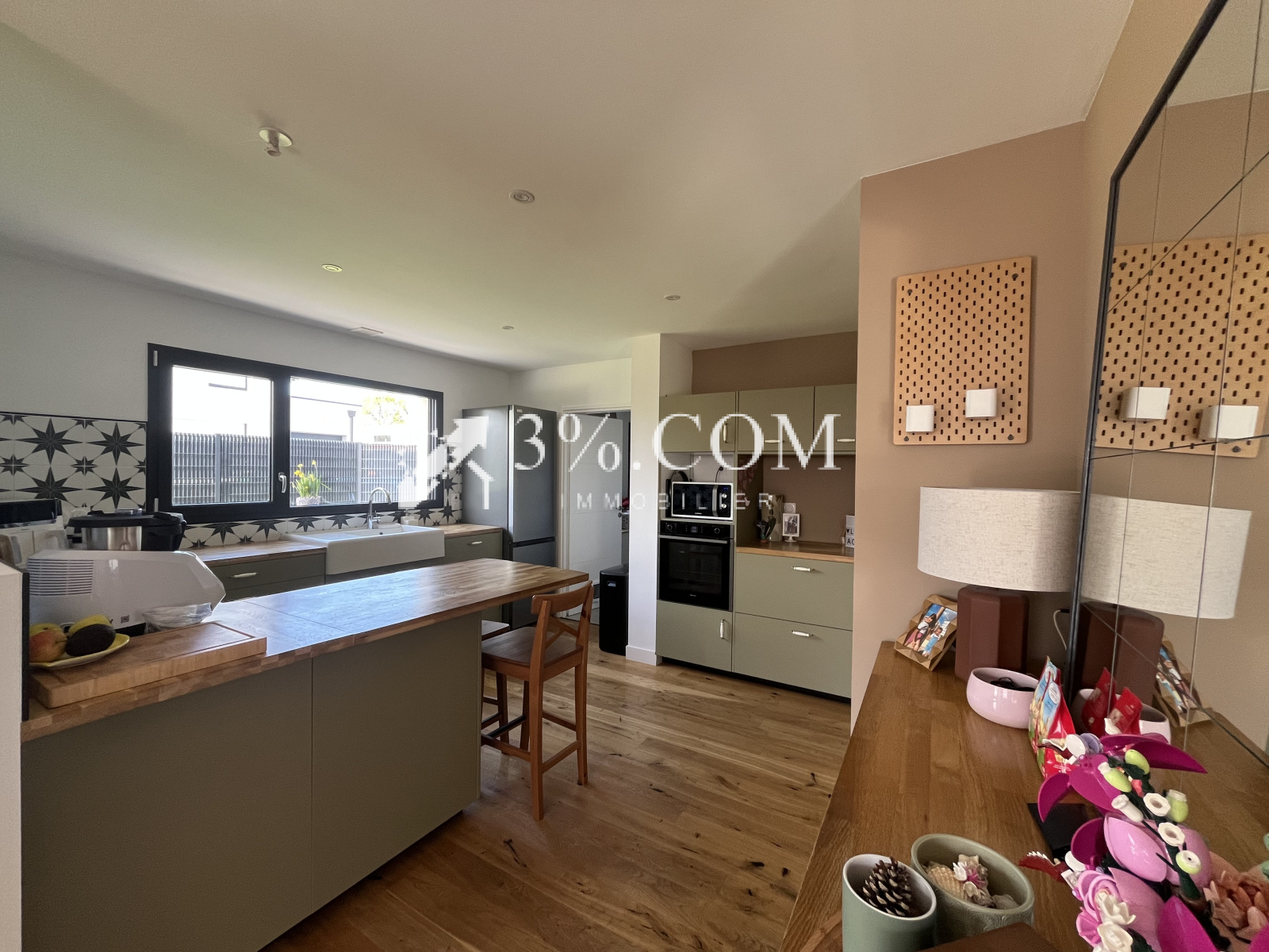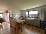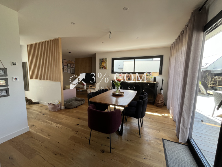 Séjour-salon-cuisine aménagée et équipée de 43 m² (parquet chêne massif) sur terrasse de 70 m² et jardin clos.