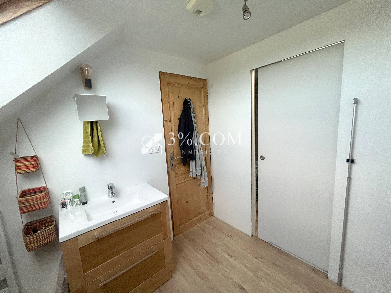 L’étage accueille un palier desservant trois chambres dont une avec un cabinet de toilette, pouvant accueillir une salle d’eau transformant cette chambre en suite parentale et un WC indépendant.