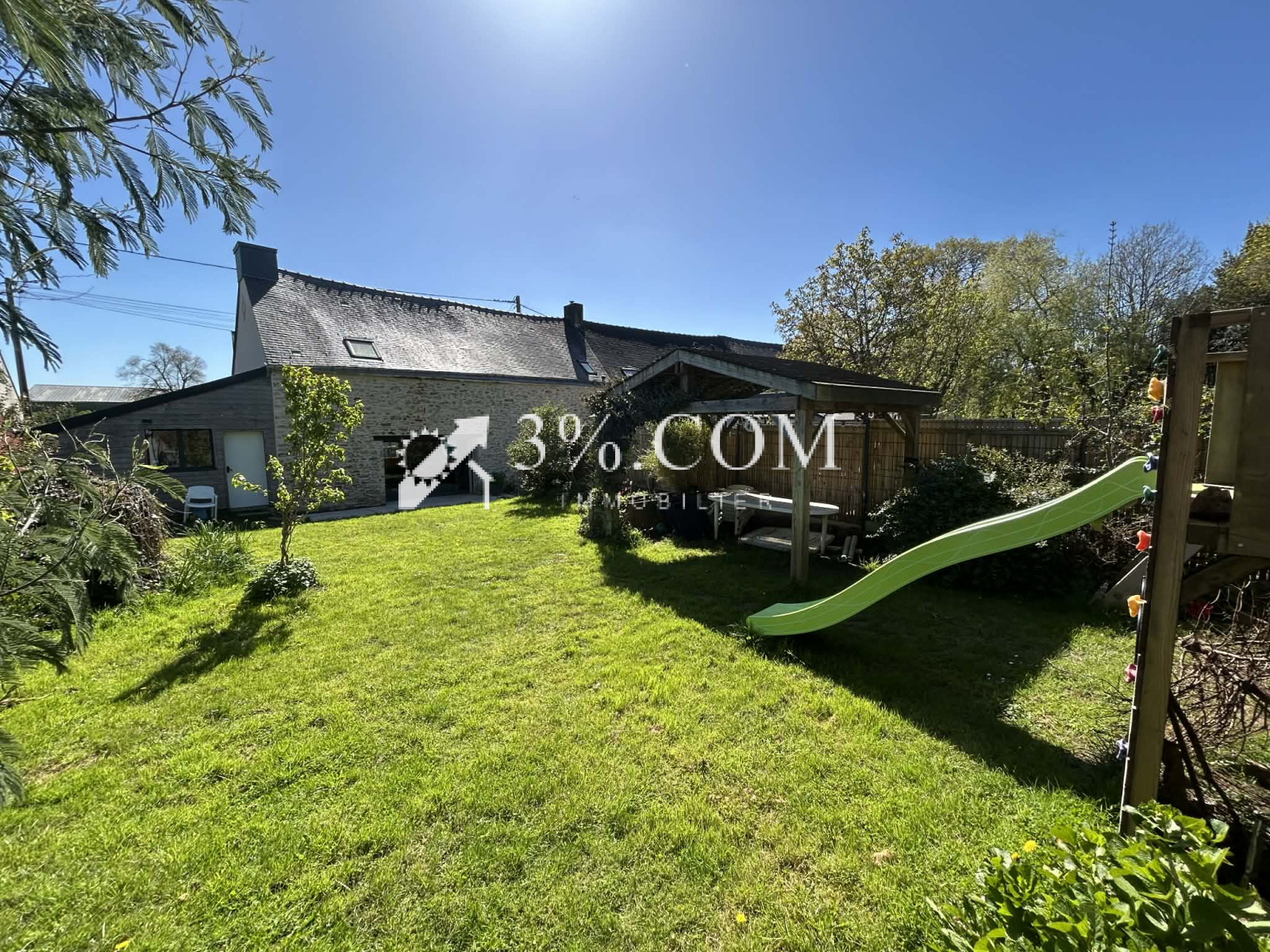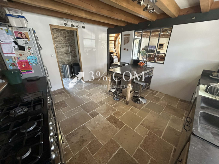 En collaboration avec Laurent Absin 3%.COM IMMOBILIER. Venez découvrir Cette maison en pierre construite sur une parcelle de 360m², mitoyenne d’un côté qui a été pensée pour offrir un cadre de vie chaleureux, lumineux et respectueux de l’environnement, avec un système d’aérothermie performant sur les deux niveaux.Au rez-de-chaussée laissez-vous séduire par une pièce de vie conviviale, ouverte sur le jardin grâce à une grande baie vitrée à galandage. La cuisine indépendante, spacieuse et fonctionnelle, ainsi que la buanderie et le WC complètent ce niveau avec praticité.À l’étage, une mezzanine apporte du volume et dessert trois chambres, un dressing commun et une agréable salle d’eau avec baignoire et WC, pensée pour le confort du quotidien.Côté extérieur, agréable jardin équipé d'une terrasse, avec un garage isolé attenant, un puits sur la parcelle, et un abris en pierres.Un bien rare, où authenticité, performance énergétique et choix de matériaux responsables se rencontrent.Maison raccordée à la fibre et au tout-à-l'égout. Pour toute visite, merci de contacter RAPHAEL BAHOLET 06/72/64/91/59 Agent commercial chez 3%.com Immobilier - RSAC VANNES 891 817 249 Annonce proposée par un agent commercial. REF 37652