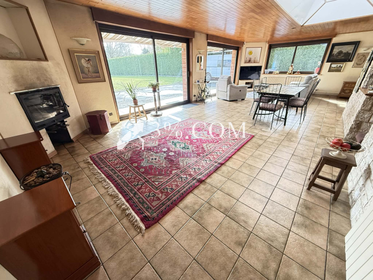 Grande pièce de vie de plus de 85 m² avec baies sur le jardin et cheminée de feu de bois avec insert