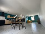 La visite se poursuit vers une grande pièce de vie lumineuse, pensée pour les moments du quotidien comme pour recevoir, ouverte sur une cuisine équipée. L’ensemble s’ouvre naturellement sur la terrasse, idéale pour profiter des beaux jours et du jardin.