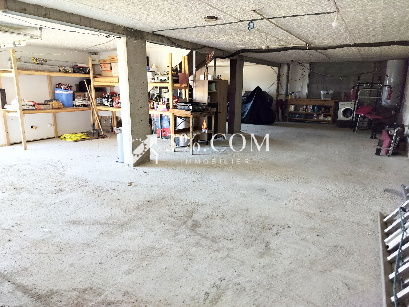 - Au rez de chaussée : Un immense garage pouvant aisément accueillir deux véhicules et un studio indépendant facile à créer, donne sur un parvis gravillonné pouvant accueillir 4 véhicules. Il est fermé par un portail automatique. Un escalier en béton dessert le niveau d’habitation.