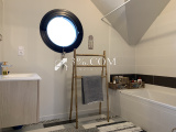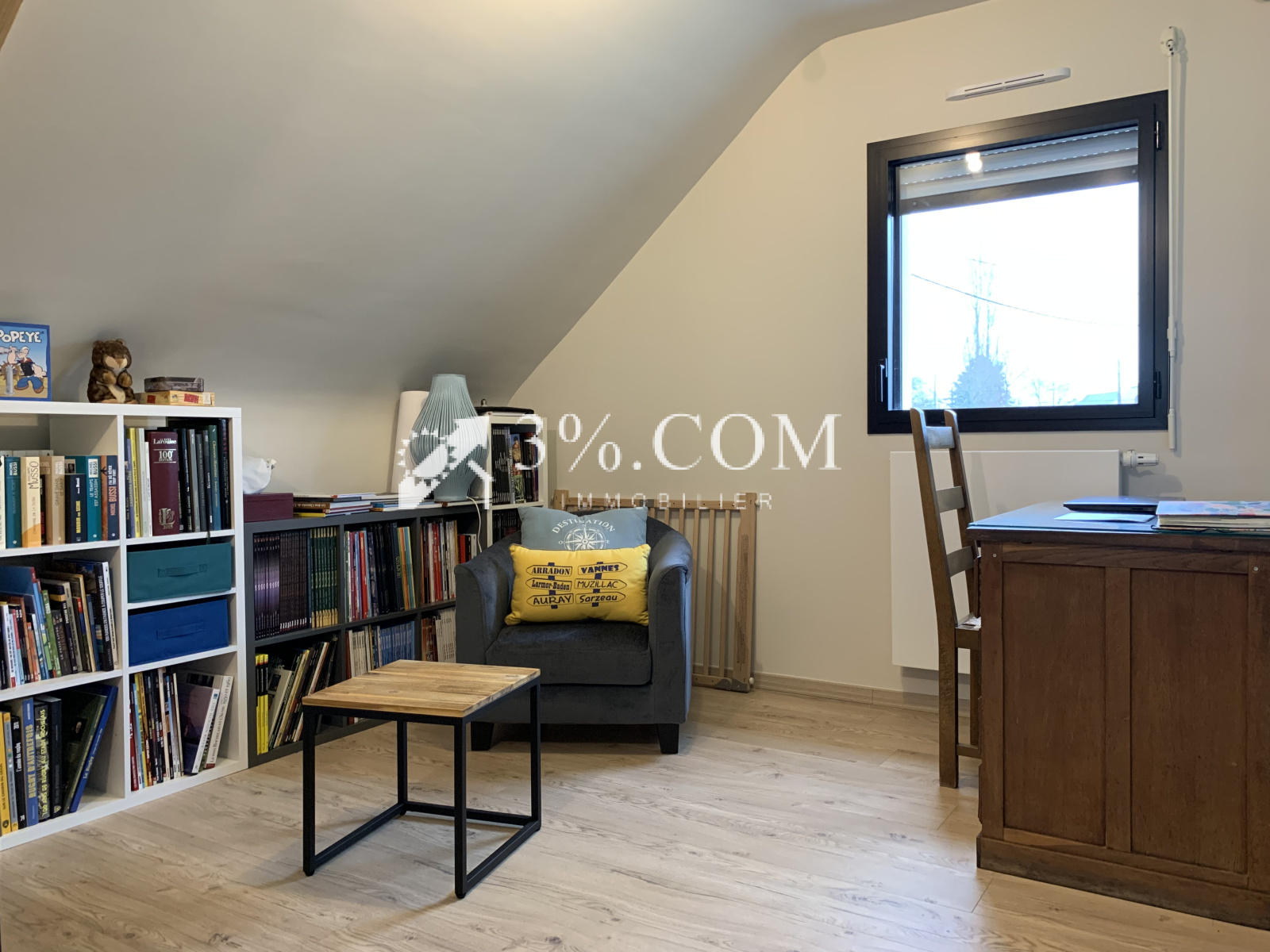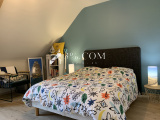 A l'étage, se trouve une mezzanine aménagée en bureau-bibliothèque, deux grandes chambres avec placards, une salle de bains, WC séparés.