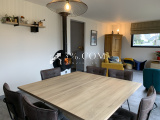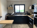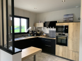 Elle comprend au rez-de-chaussée, une entrée avec placards, une lumineuse pièce de vie avec poêle à bois, cuisine semi-ouverte équipée et aménagée(avec une vitre d'atelier), une arrière-cuisine (local technique), belle suite parentale (salle d'eau, rangements et chambre).