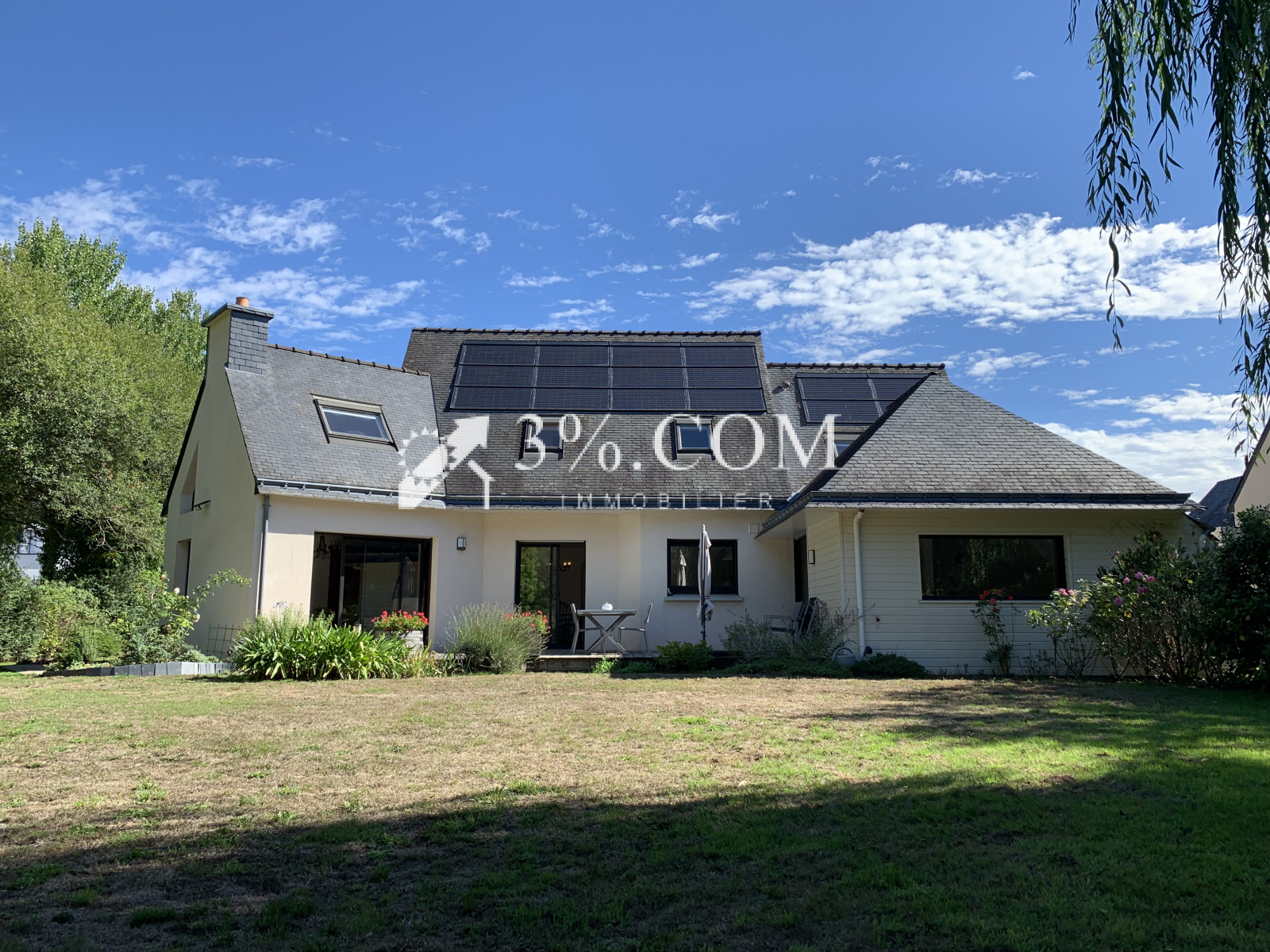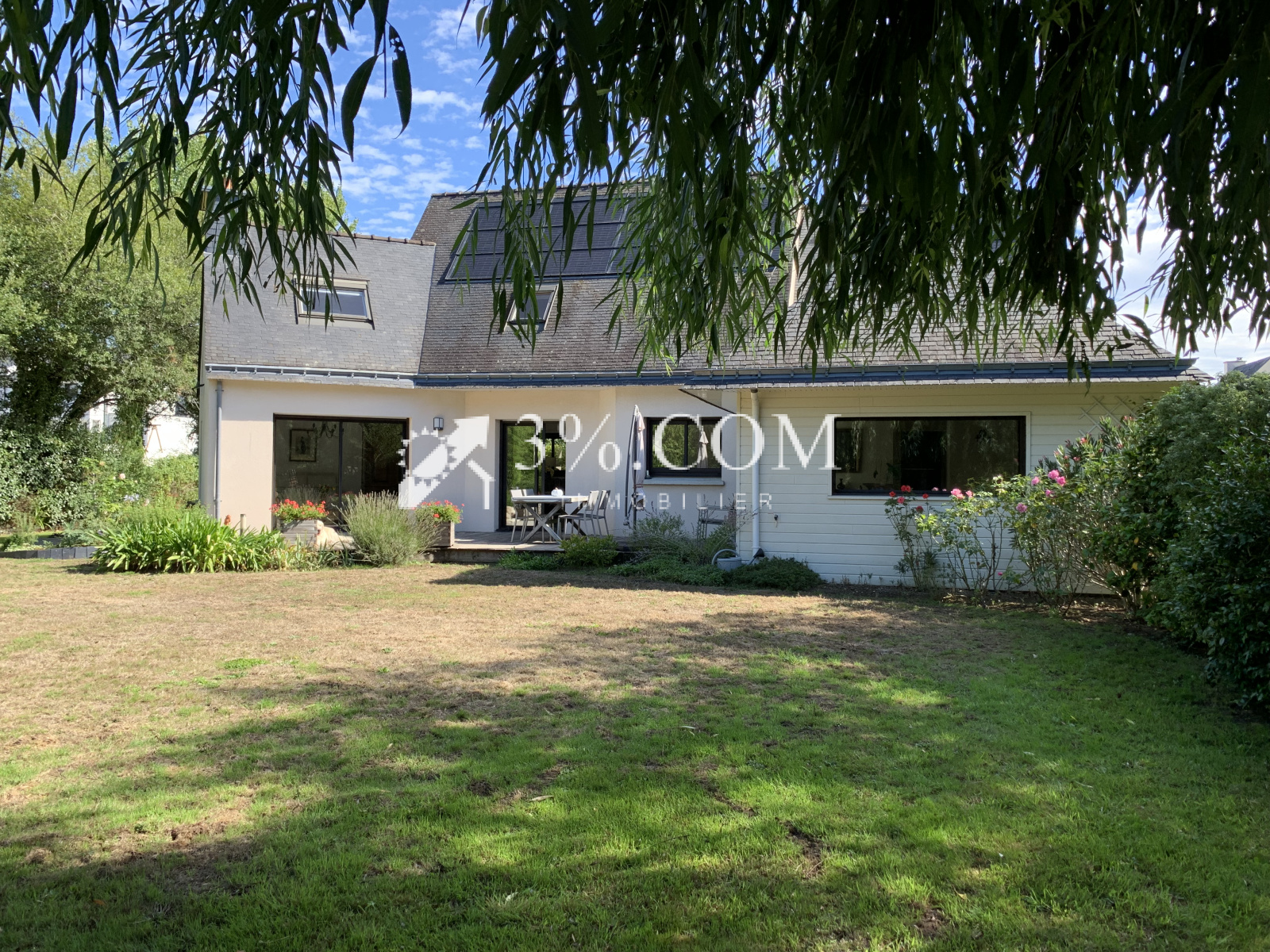La maison est implantée sur une parcelle de 700m², arborée, clos, une grande terrasse en bois accessible depuis le séjour, la cuisine et la suite parentale