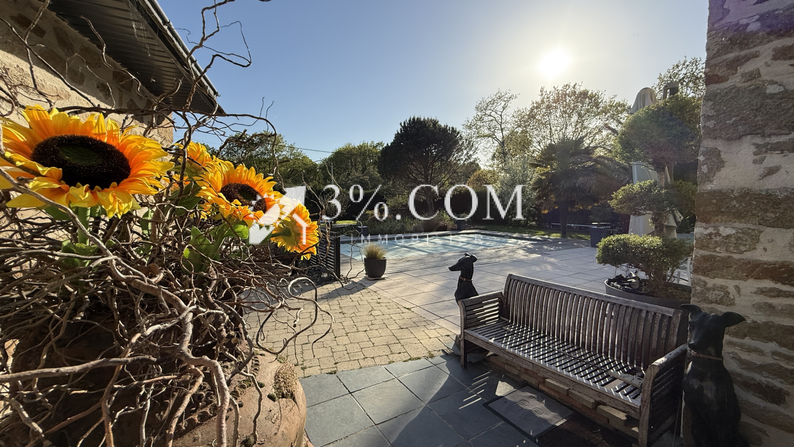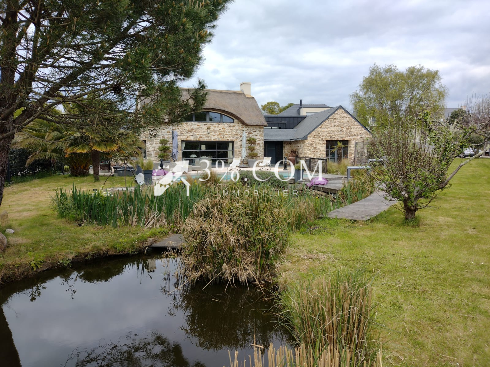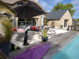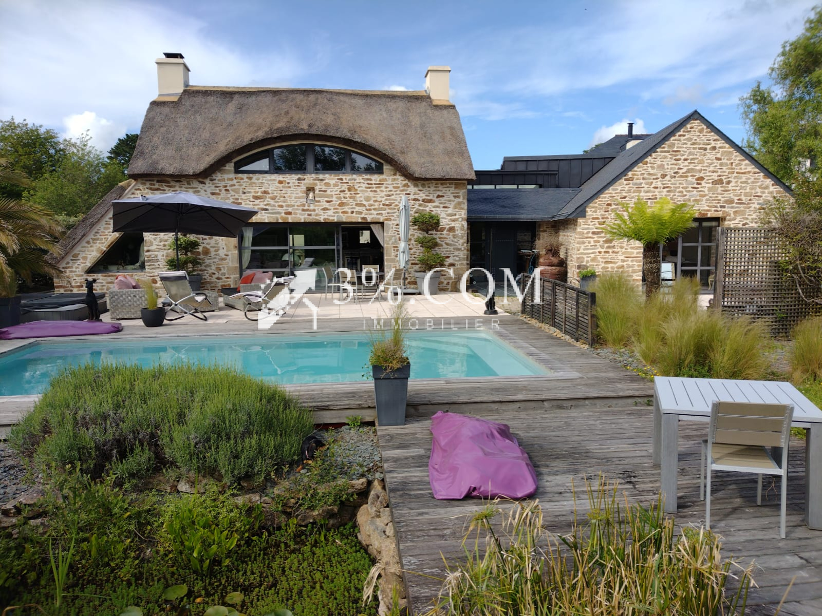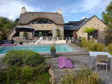 Dès l’extérieur, vous serez séduit par cette bâtisse en pierre au cachet authentique, coiffée d’une superbe toiture en chaumes. Elle s’ouvre sur une vaste terrasse en bois avec piscine, véritable espace de détente idéal pour profiter des beaux jours.
