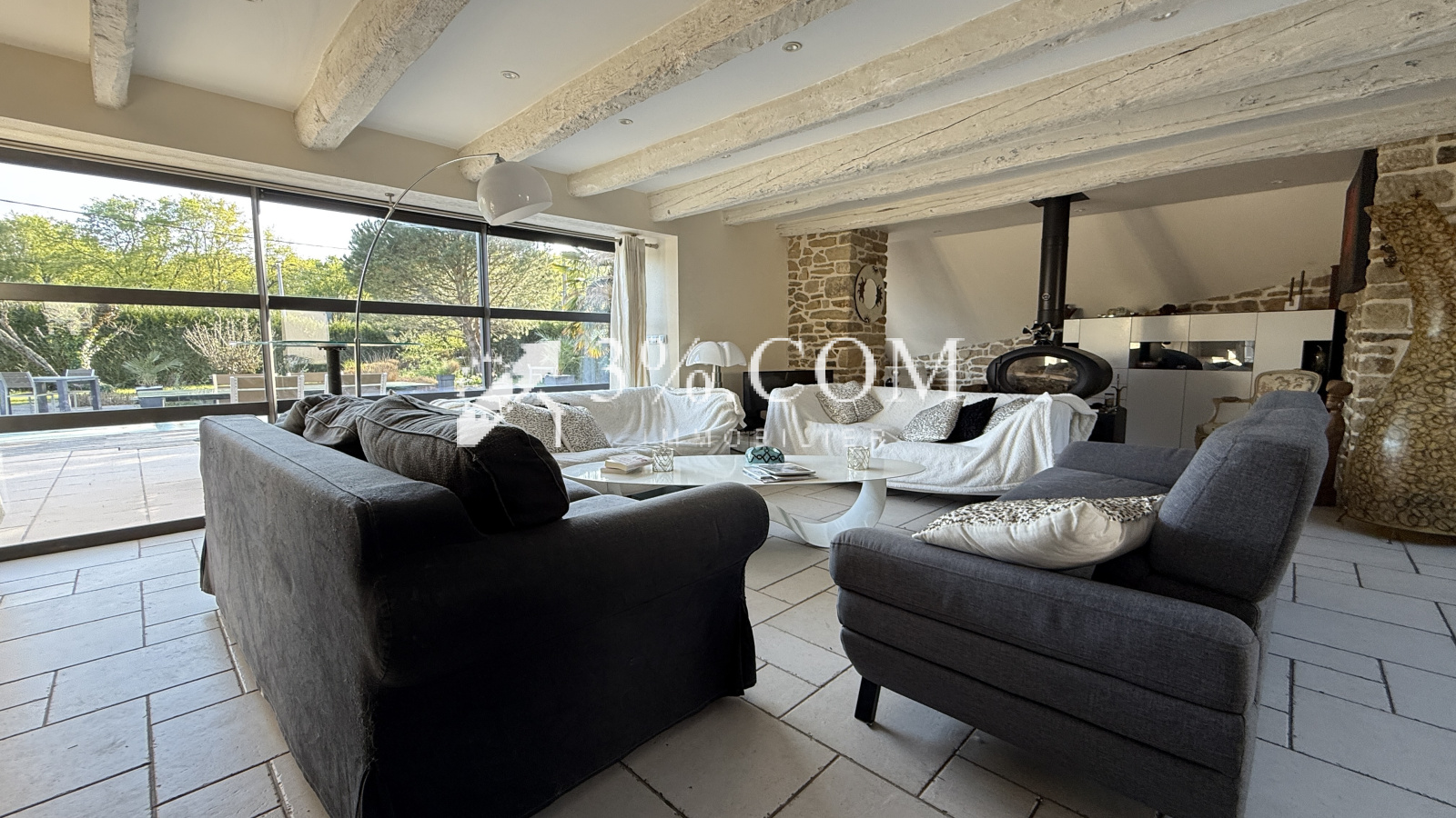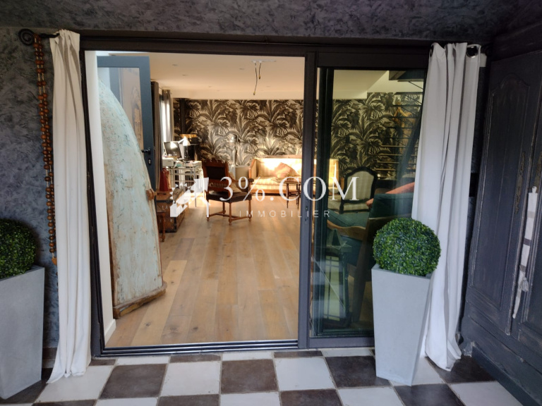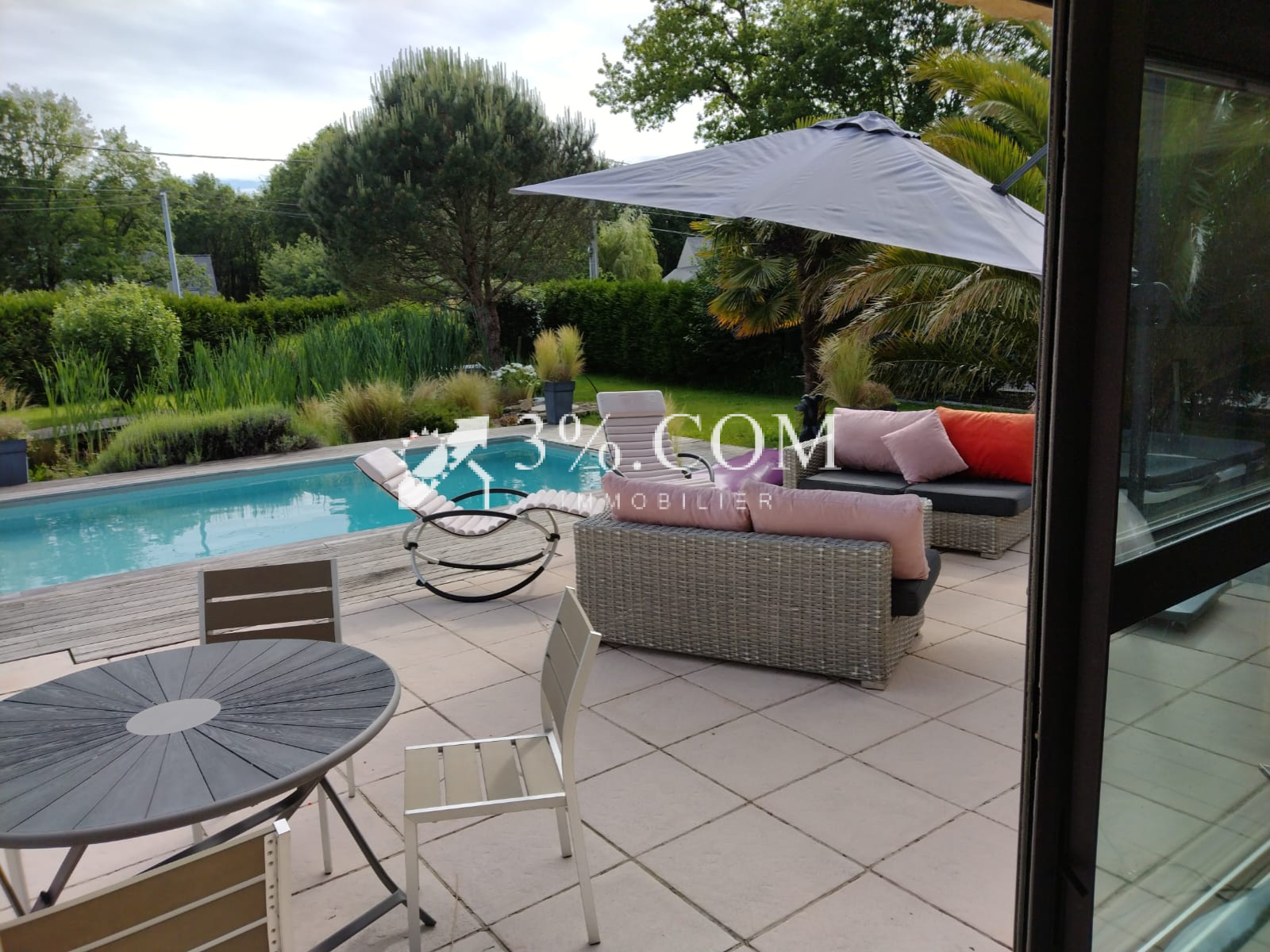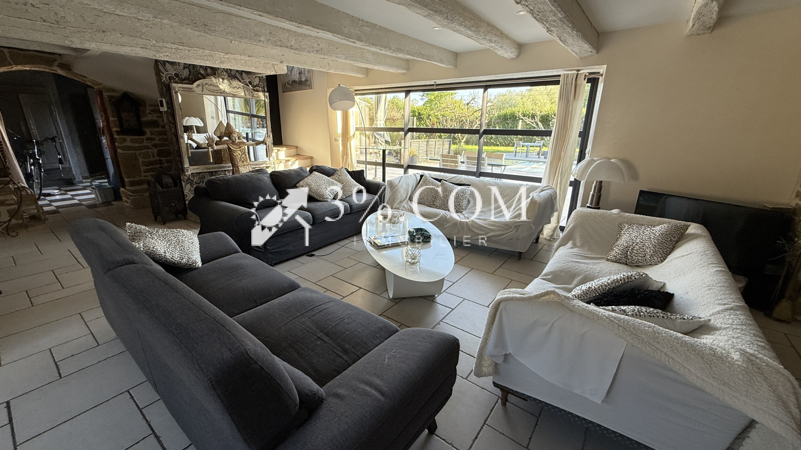 - Une spacieuse pièce de vie baignée de lumière grâce à de larges ouvertures donnant sur le jardin et la piscine.