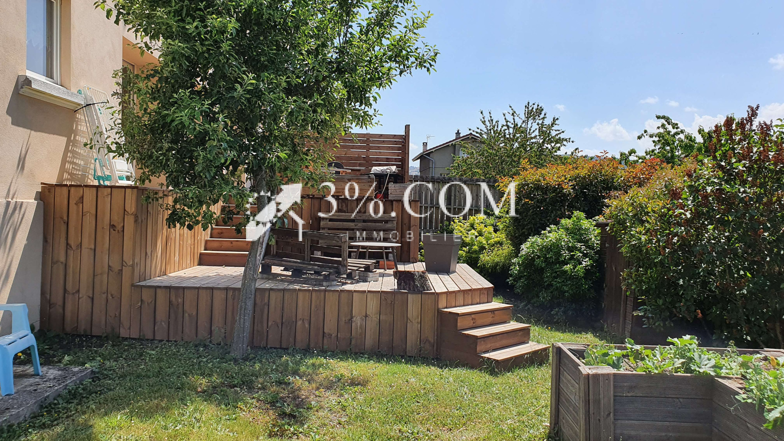 Terrain avec cabane de rangement, arboré, fleuri, piscinable ! Le terrain et la terrasse se prêtent facilement à la réalisation d'une piscine sans vis à vis !