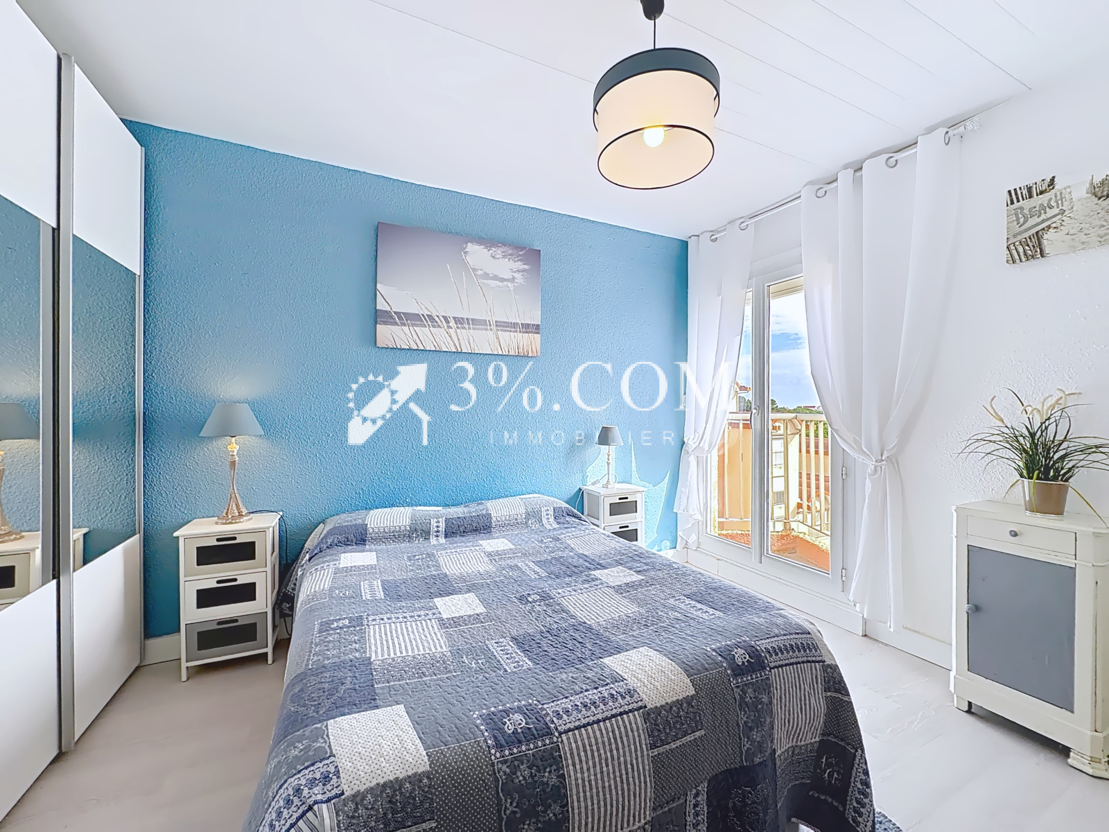 Chambre 4 de 10,8 m² avec double placard intégré, petit balcon offrant une vue sur le port et la mer au loin