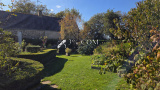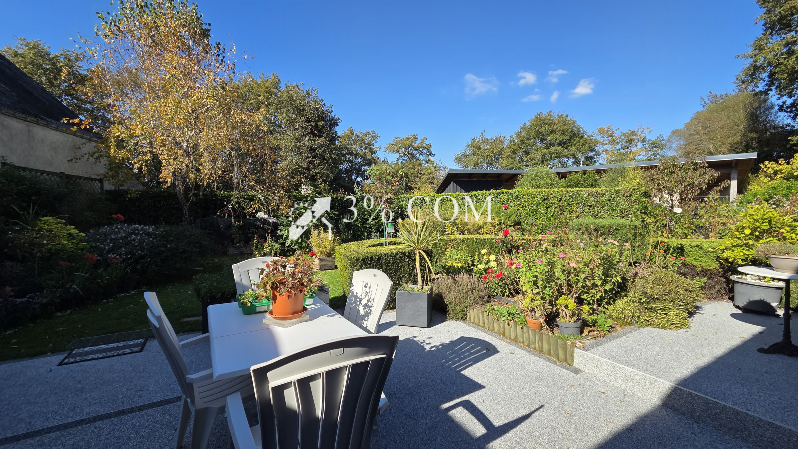 Une belle terrasse donne sur un jardin soigné, agrémenté de massifs fleuris et d’un coin potager.