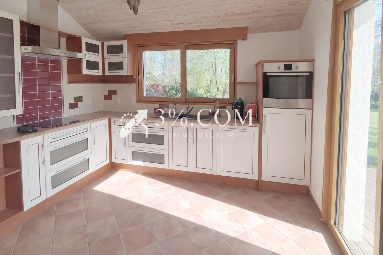 Depuis le séjour et la cuisine A & E, grâce aux baies à galandage, profitez d’un panorama verdoyant, qui se prolonge naturellement sur la terrasse,