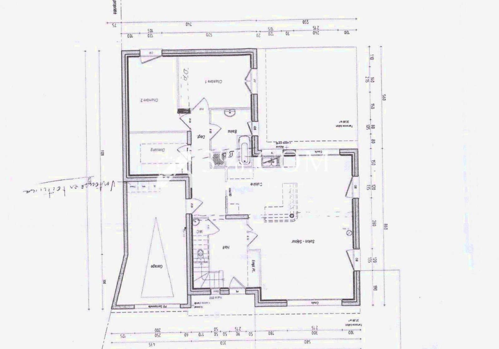 Maison raccordée au T.A.E. Chauffage Gaz de ville, volets électriques.