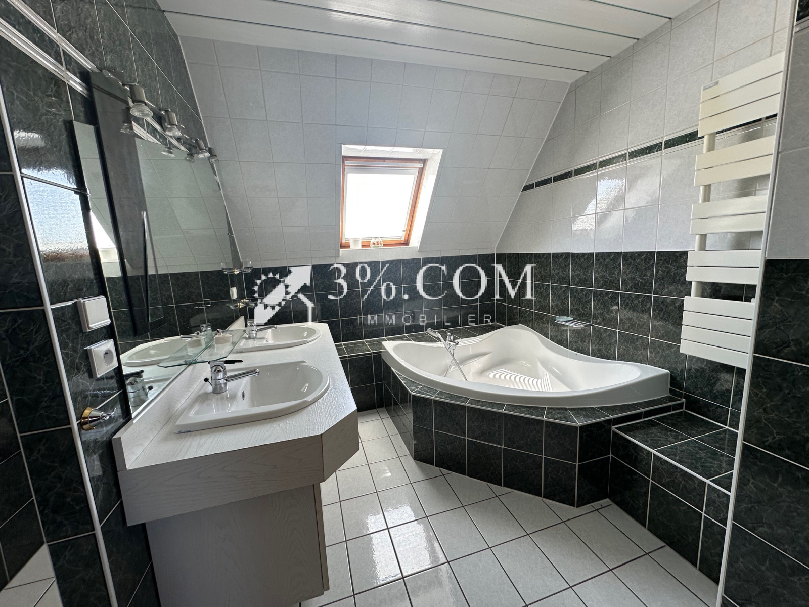 - Une salle de bains comprenant une baignoire d'angle, un meuble double vasque et un WC.