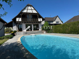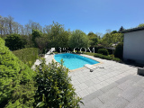 La maison dispose de 2 garages, une cour, un verger avec un petit ruisseau en contrebas, 2 terrasses et une piscine.