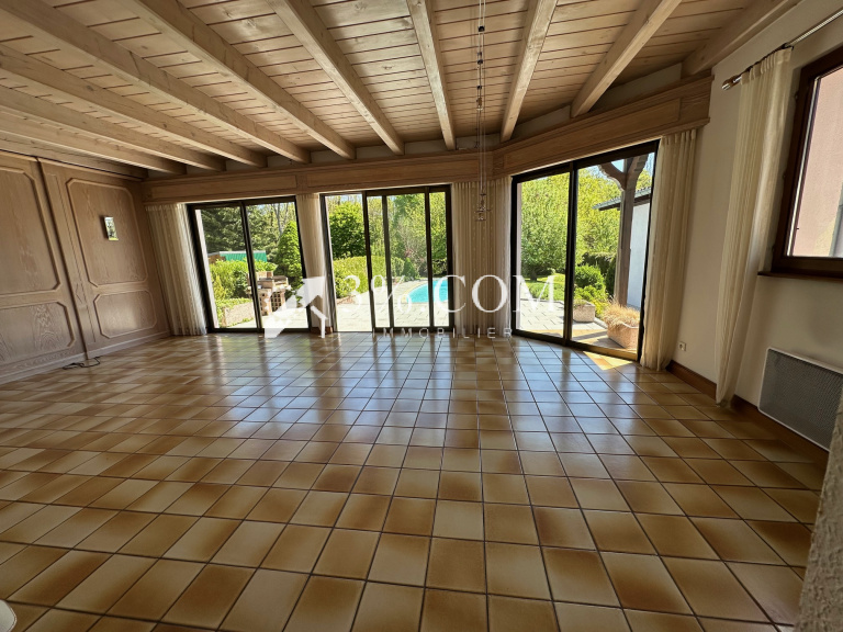 - Une véranda avec accès de plain-pied à la terrasse et une vue sur le jardin et la piscine.